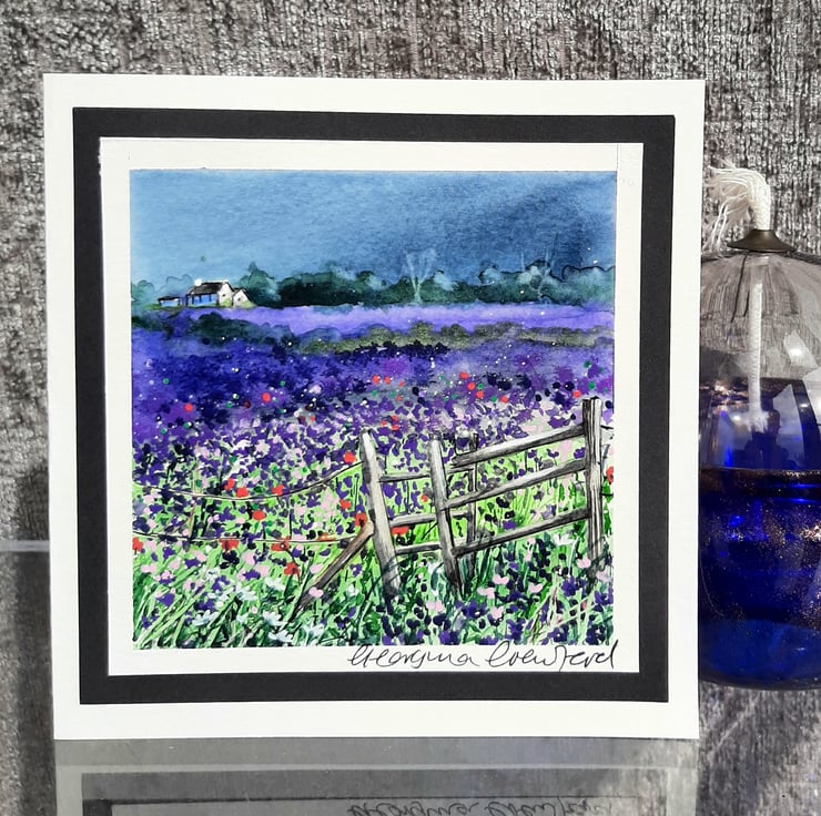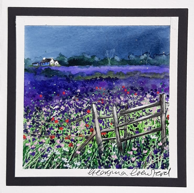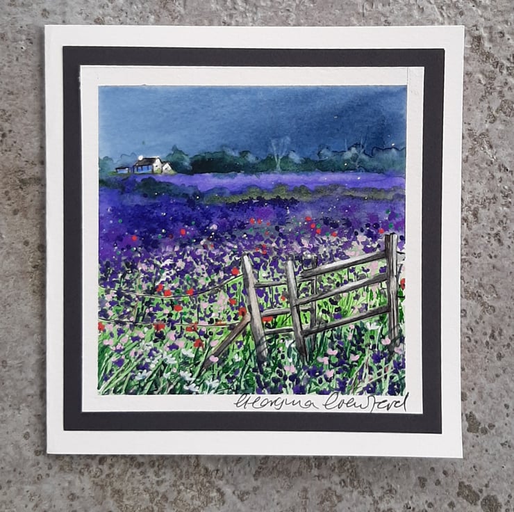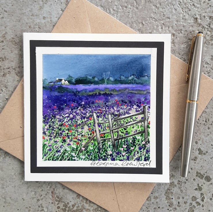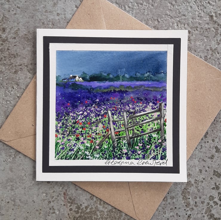 Beautiful handpainted watercolour card of a stormy sky over a field of phacelia (scorpion weed).