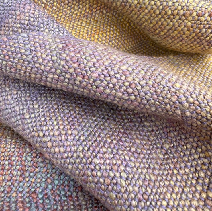 Reflecting the many hues of the deep honeyed yellows and lilacs visible as the sun sets in the sky, this soft lightweight scarf features a changing gradient of sunset colours. My hand-spun yarn, comprising 50% baby camel and 50% silk, was woven on my loom in plain weave onto a lilac-coloured Tencel warp. The scarf is 146cm long (excluding tassels) and 18cm wide, an ideal size for wearing around the neck. Hand-wash carefully at low temperature and lie flat to air dry; the scarf can be ironed at low heat.