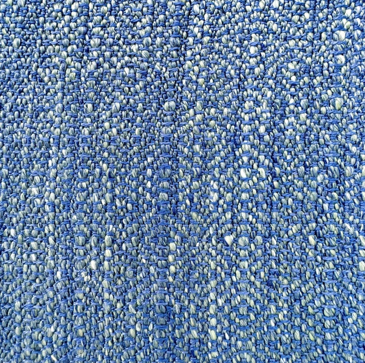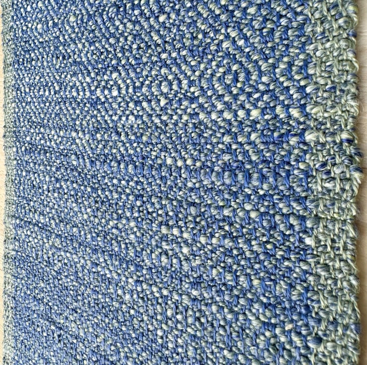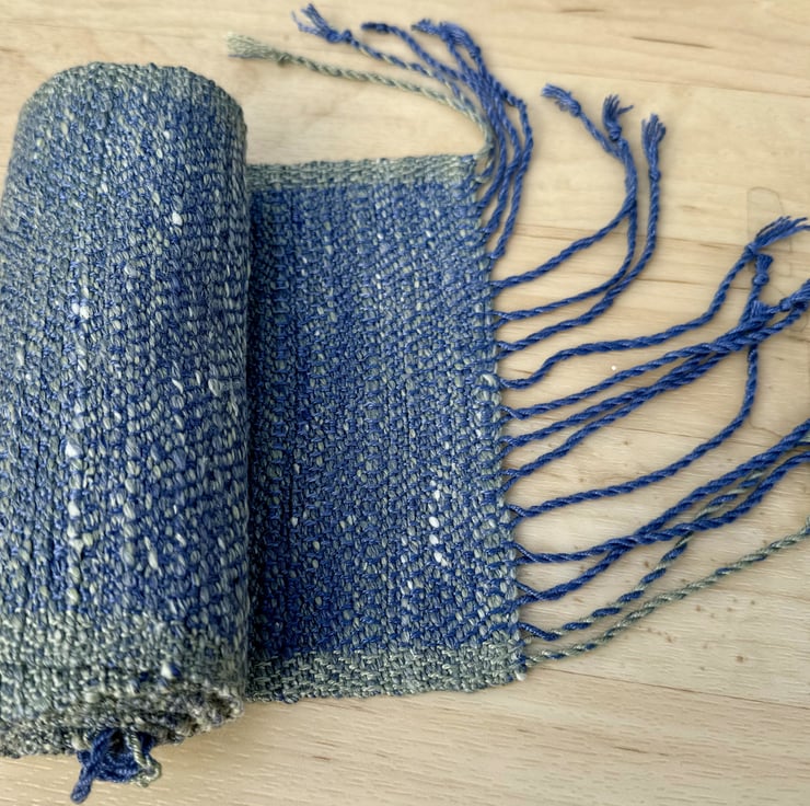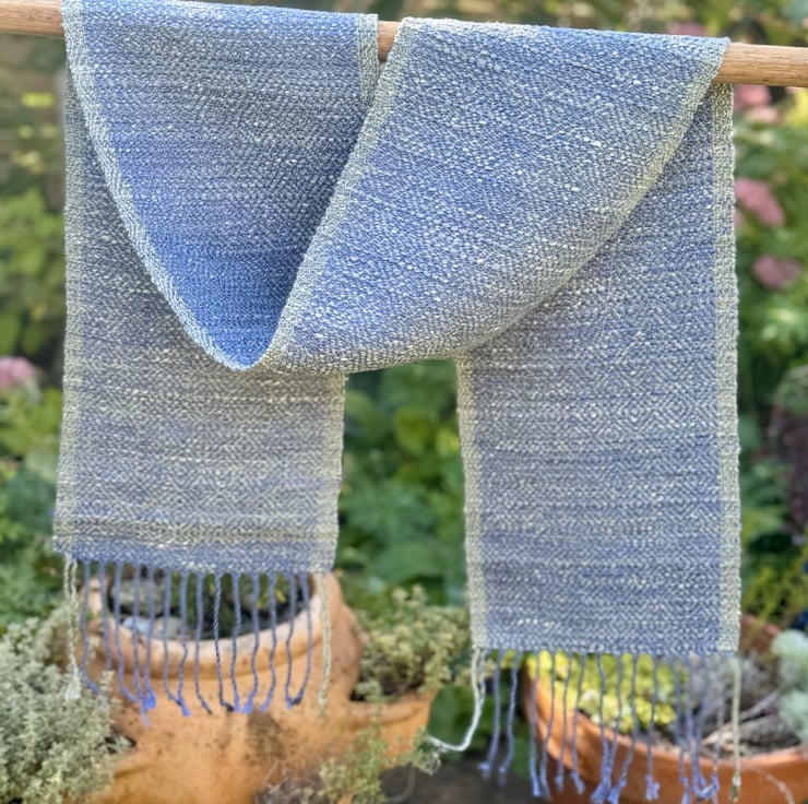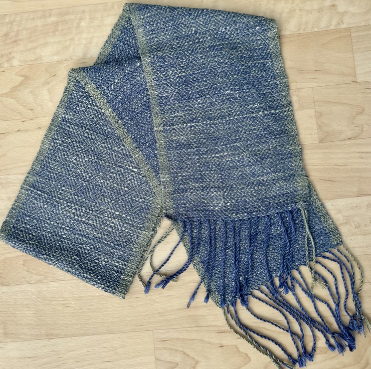 This scarf is ideal for those who can't tolerate the feel of wool against their skin - and of course anyone else who likes a soft texture. It’s made from hand-spun bamboo in a blend of light-green, white and blue. This has been hand-woven in a diamond trellis pattern onto a warp of blue-purple tencel, with narrow birch-green tencel borders. At 137cm in length and 19cm wide, the scarf is an ideal unfussy neck-warmer.