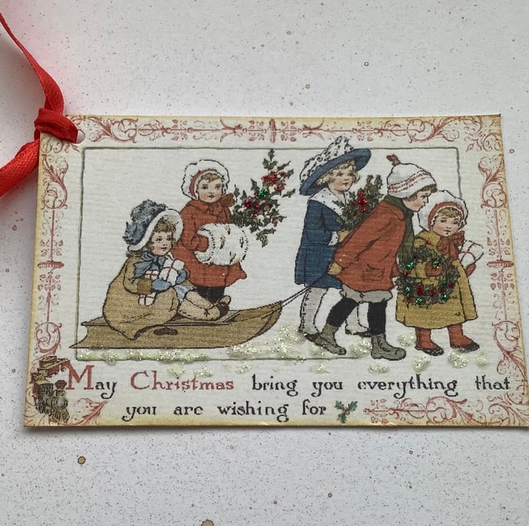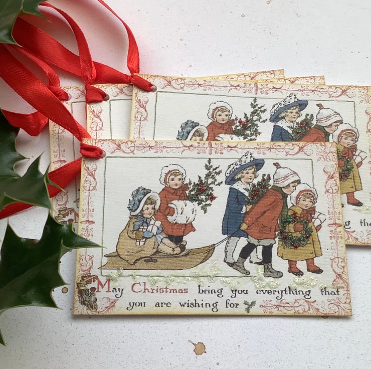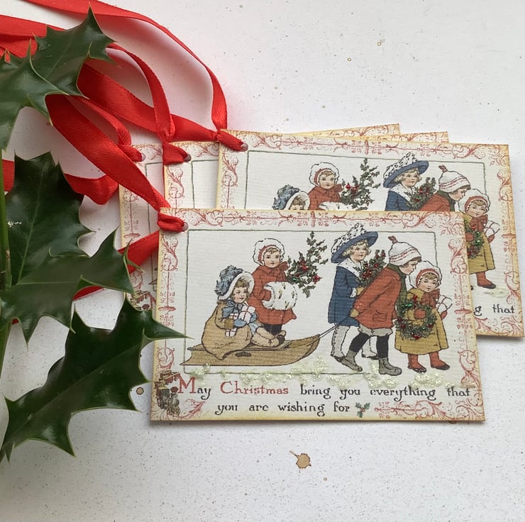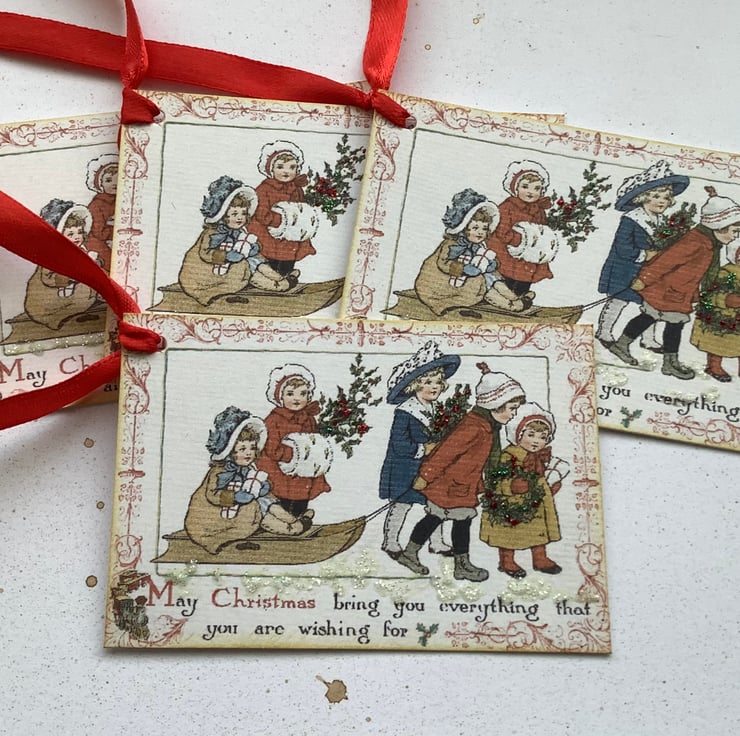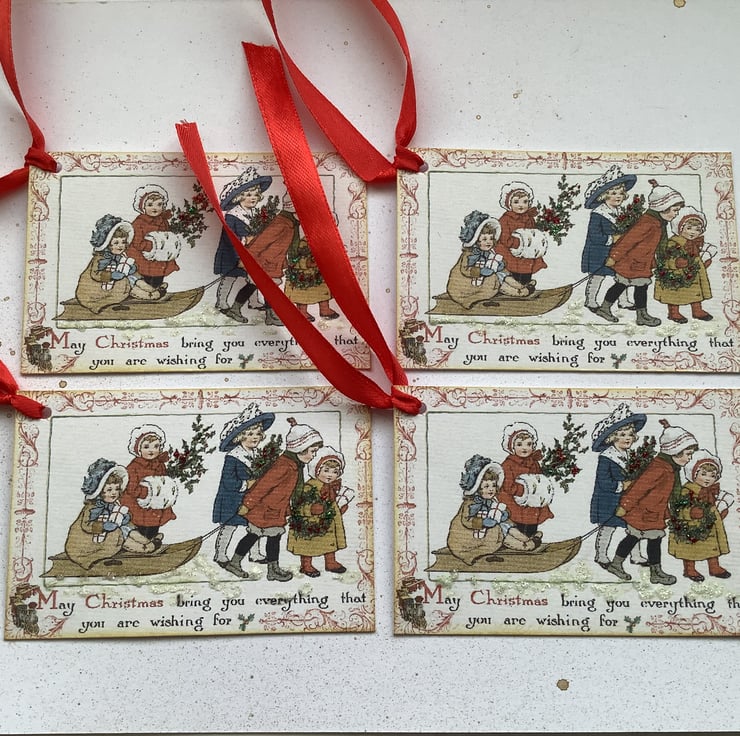 CHRISTMAS GIFT TAGS ( set of 4) vintage style. Sledge, children.