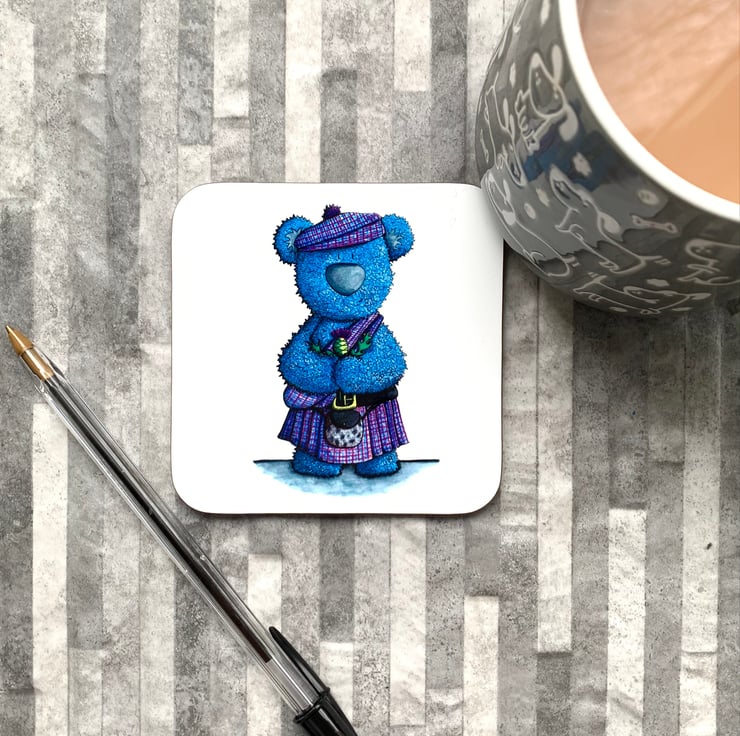 Coaster with the Scottish bear in a purple and blue tartan kilt holding the traditional Scottish thistle. The coaster comes with a miniature acrylic stand so that the design can be displayed between uses.