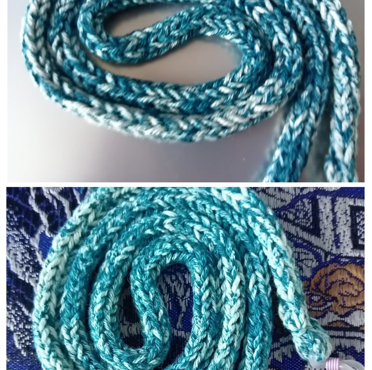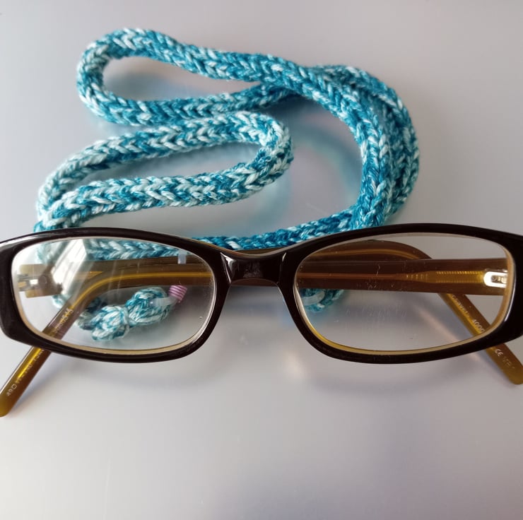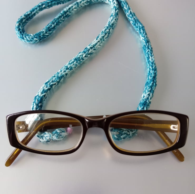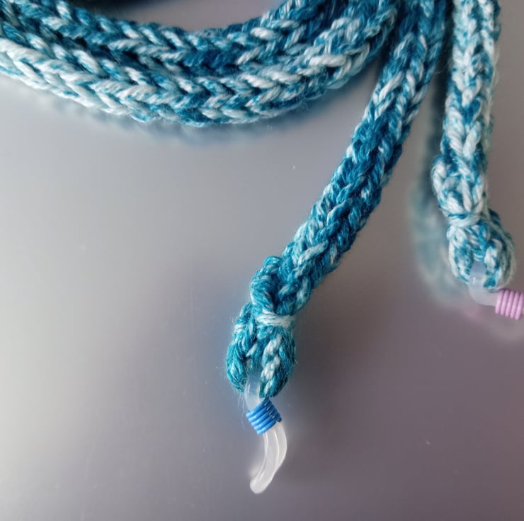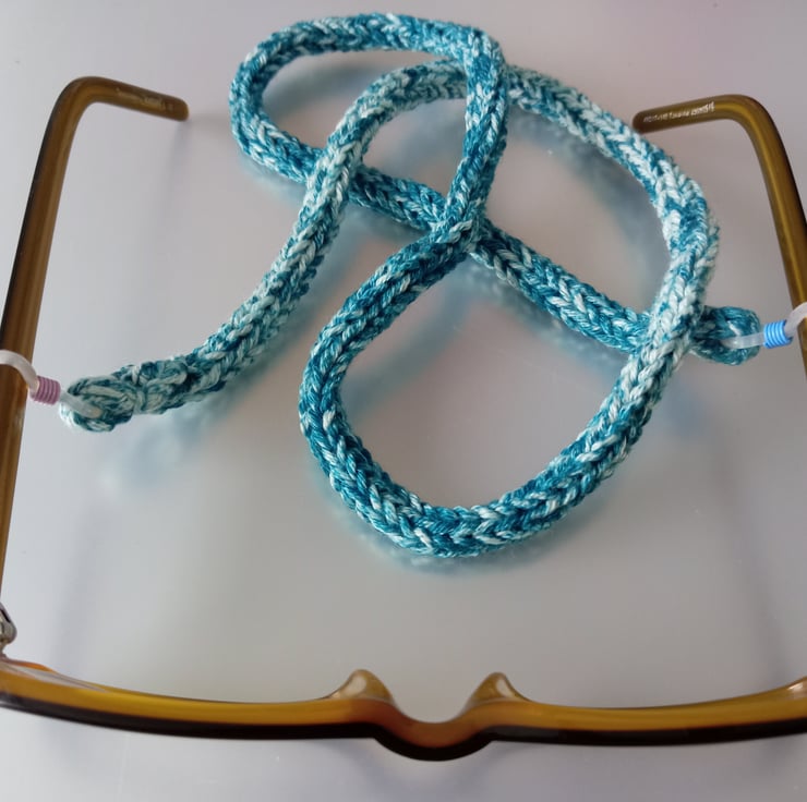 This has been made in 100% cotton yarn and has white rubber ends with mismatched pastel colour sliders to hold your glasses in place.