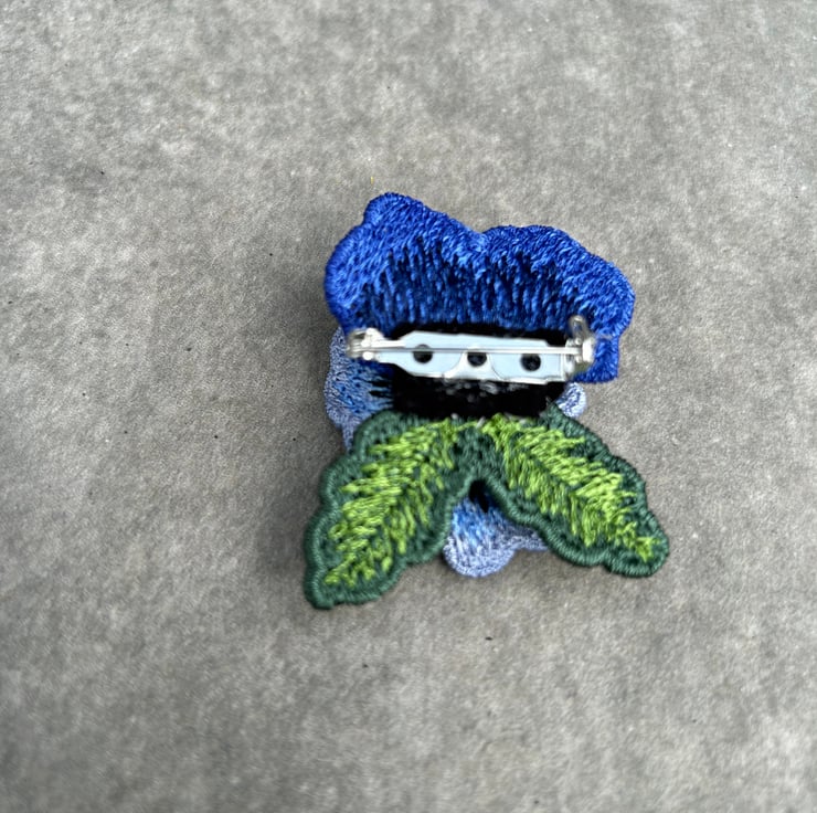Machine embroidered blue and purple Pansy lace Brooch with green leaf and one tiny sparkly glass crystal in the centre