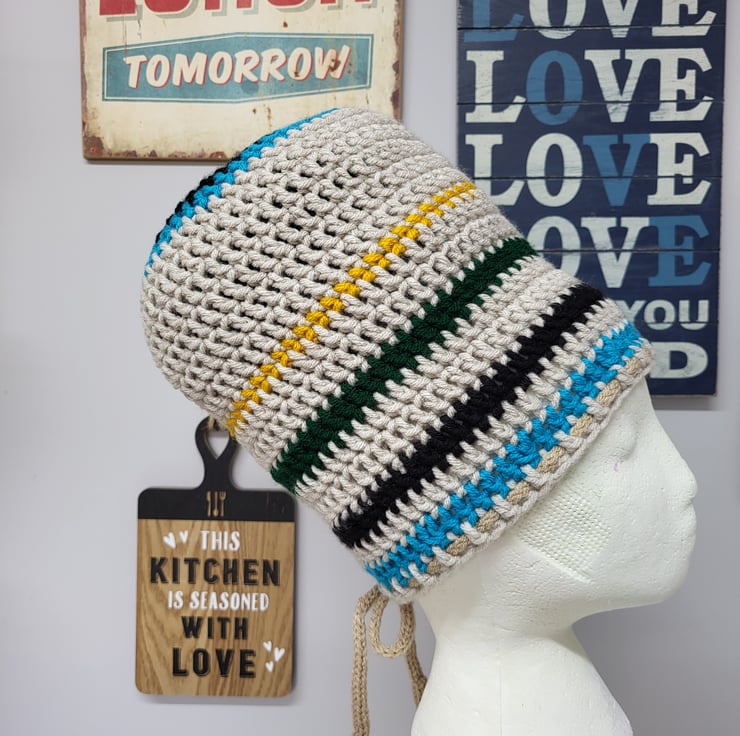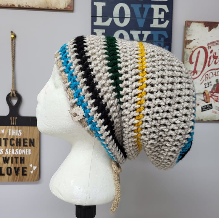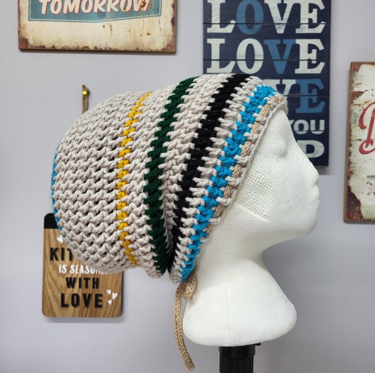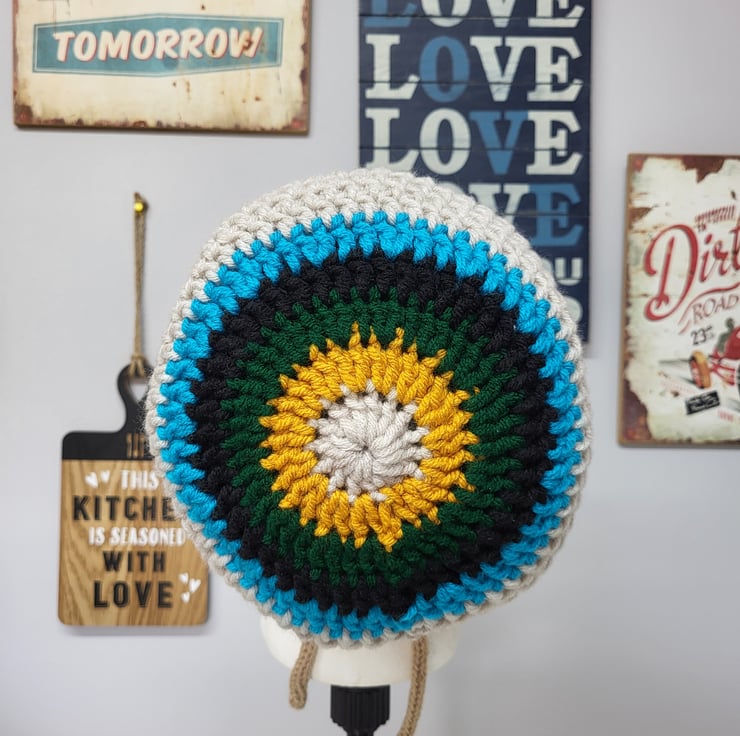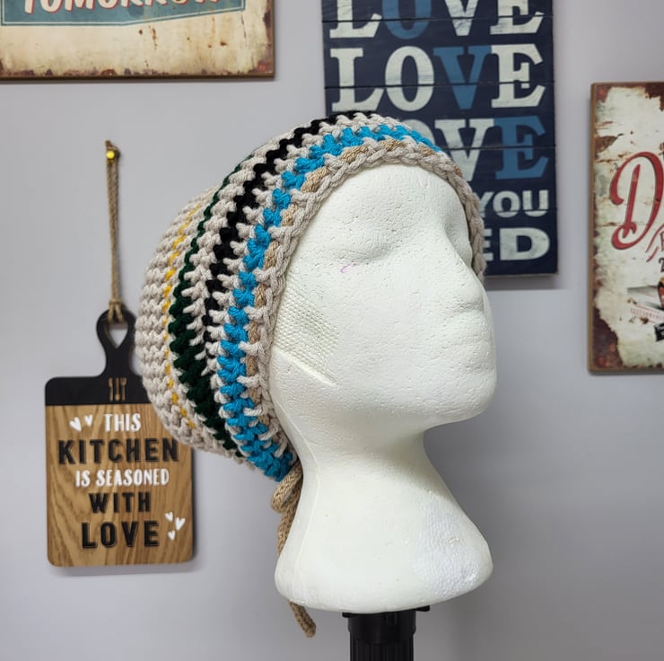 Add a unique and stylish touch to your wardrobe with this handmade crochet Rasta tam. Designed in a boater style, this hat is perfect for hippie and festival enthusiasts looking to express their individuality. Made to be unisex, it fits most head sizes, and an extra shoelace has been added for easy adjustment. Whether you're dancing at a festival or embracing your inner free spirit, this Rasta tam is the perfect accessory to complete your look.