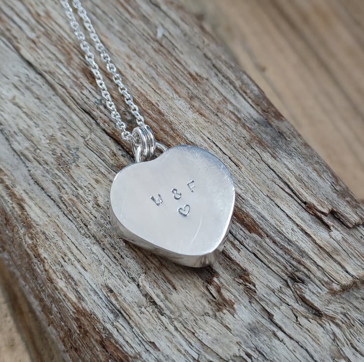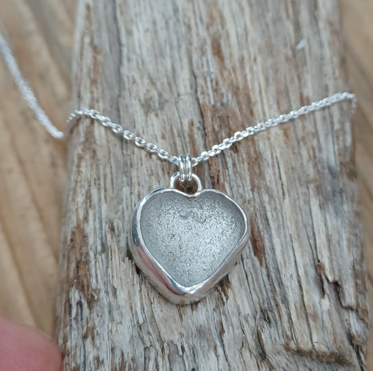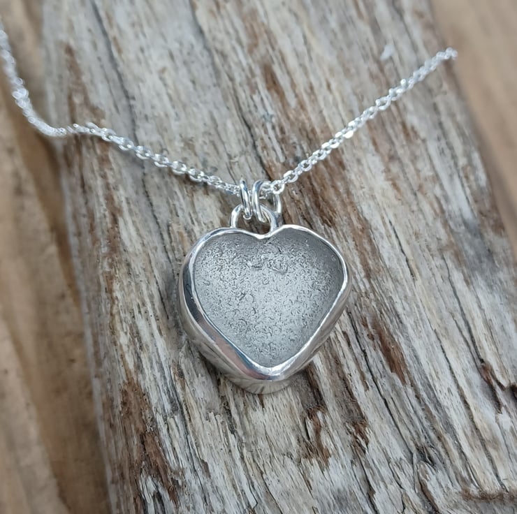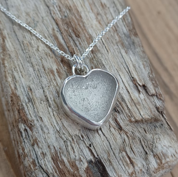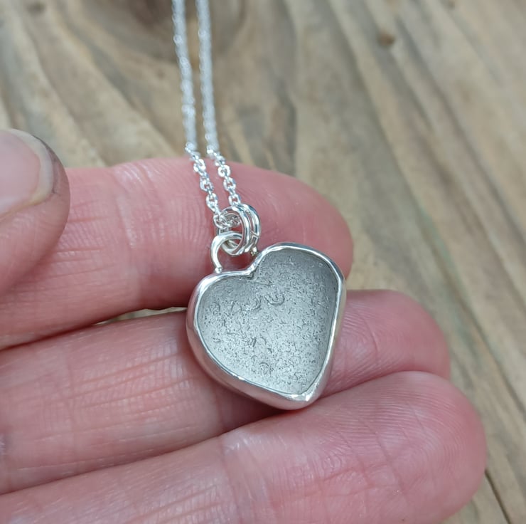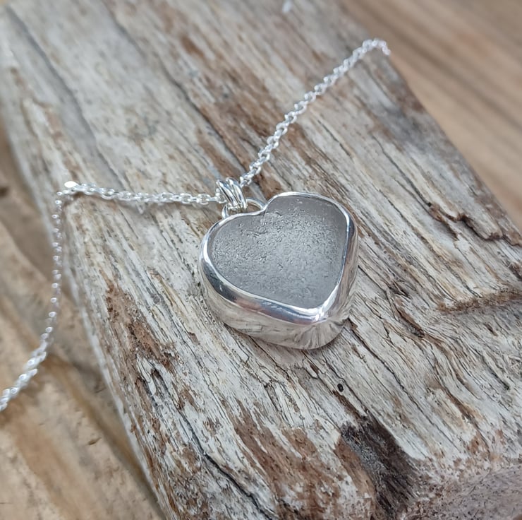 Made from sterling silver, fine silver and sea glass. I've cut out an organic heart shape from a piece of white frosted sea glass and used traditional silversmithing techniques to set in a silver bezel. Polished to a high shine .