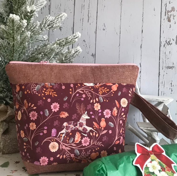 The bag has a free motion embroidered Rosie the reindeer on the front and It is a fully lined with a gorgeous matching cotton printed fabric.