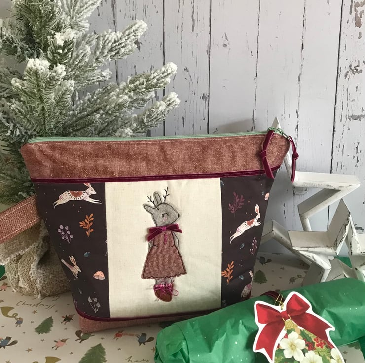 The bag has a free motion embroidered Rosie the reindeer on the front and It is a fully lined with a gorgeous matching cotton printed fabric.