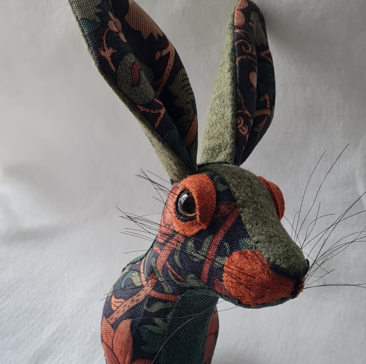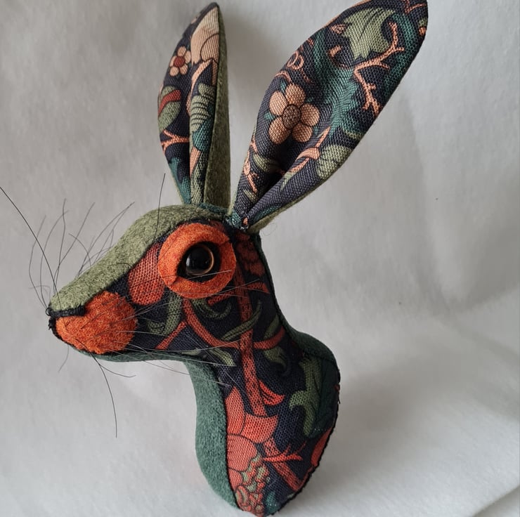 A lifesize faux hare which I have handmade and covered in hand stitched William Morris fabric. The head is backed with felt and has a keyhole metal plate to hang it on the wall. It is lightweight.