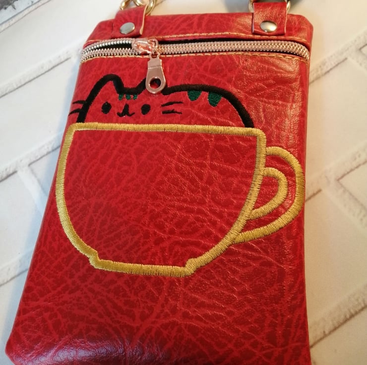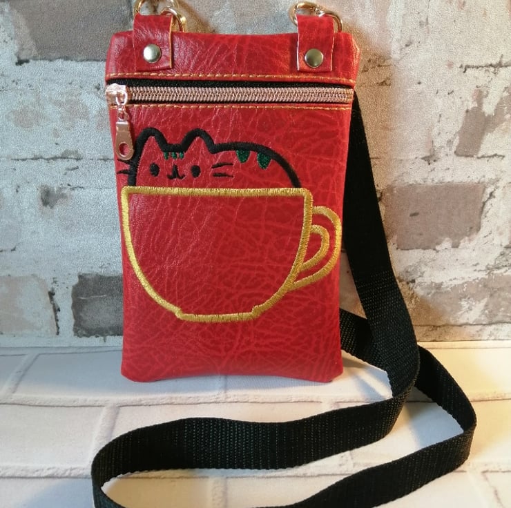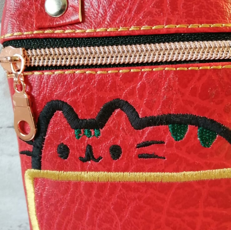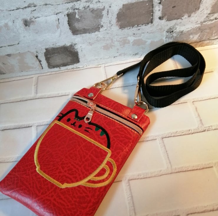 This cute childs crossbody bag is made in a bright red faux leather with a black detachable strap. I have made this bag fully lined with a lovely rose gold coloured zip fastenting. I have enbroided a cat in a cup on the front which is delightful. I am sure this bag would bring a smile to the little recipients face.