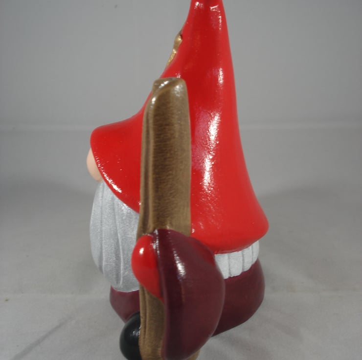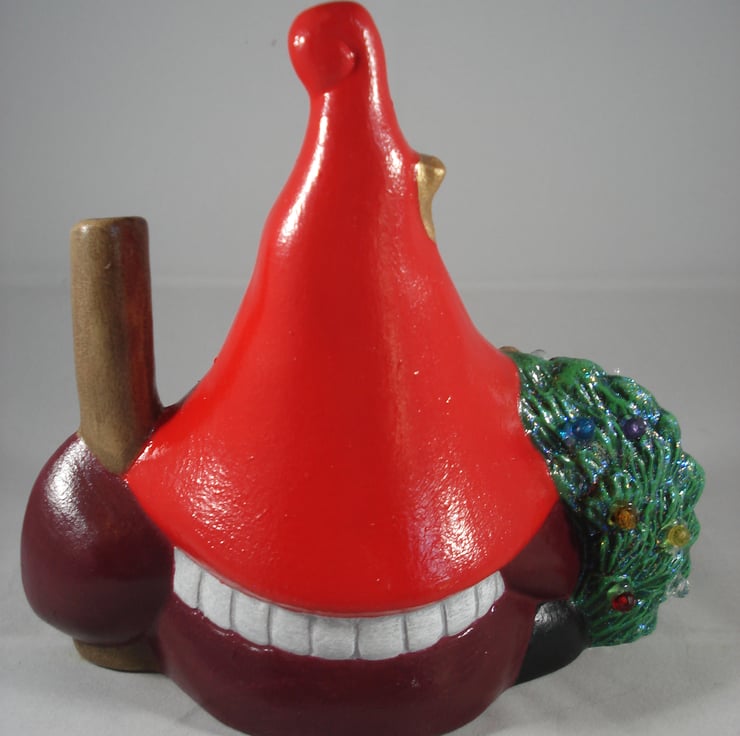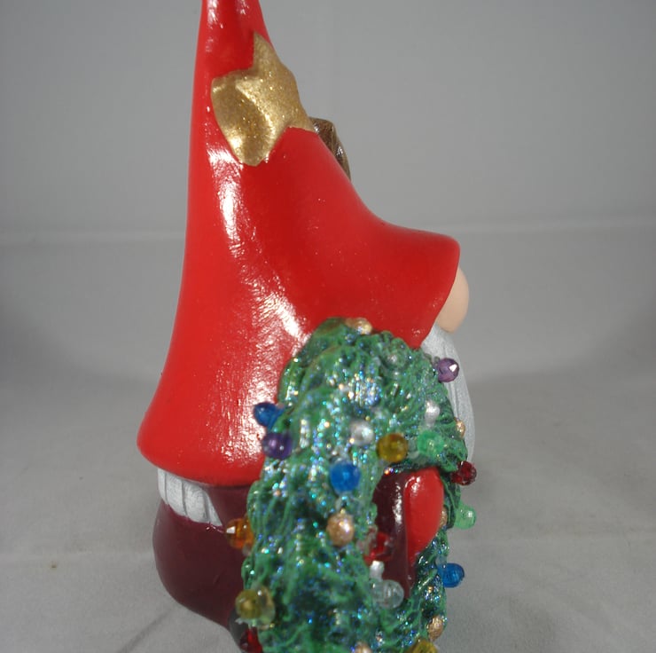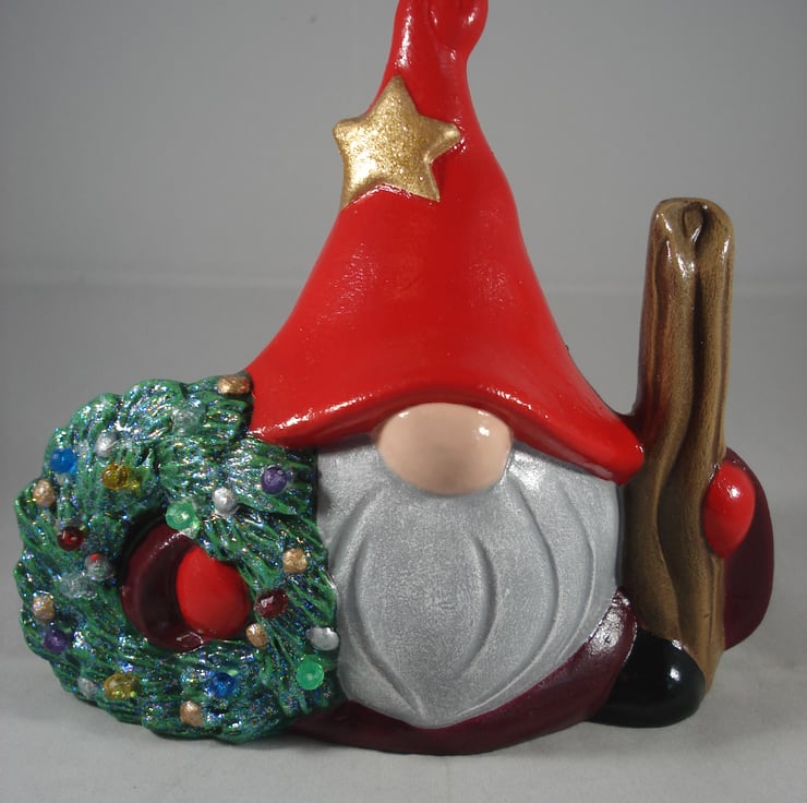 I have for sale a ceramic Christmas ornament, which was hand painted by myself. It is a cute looking gnome/gonk, holding a Christmas wreath in one hand and a walking stick in the other. This would make a lovely addition to anyone's Christmas decorations, or perhaps given as a gift.