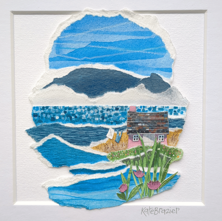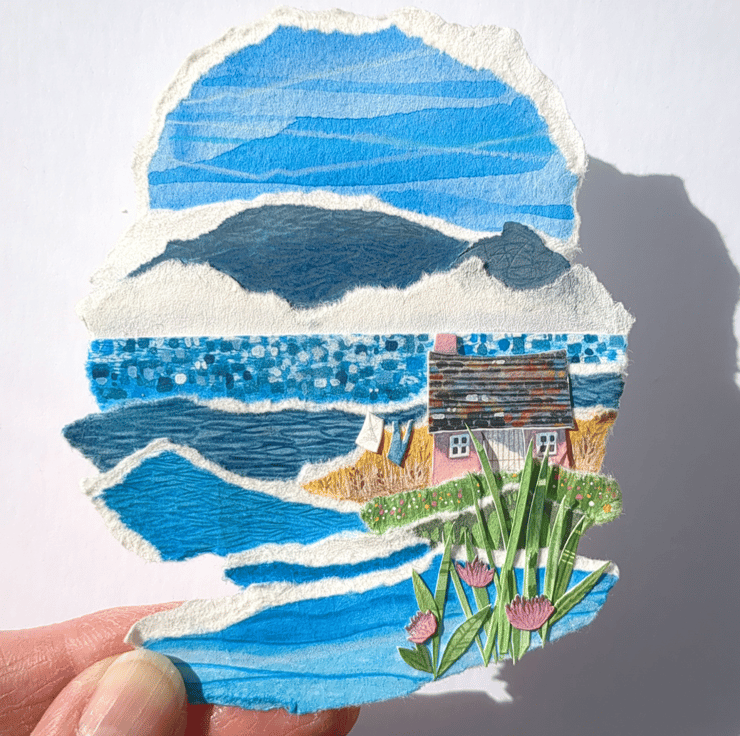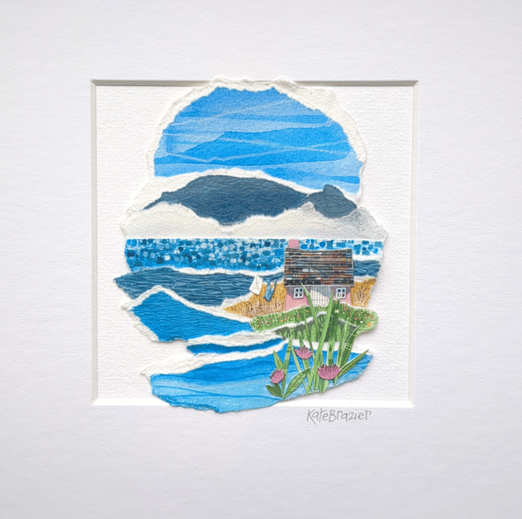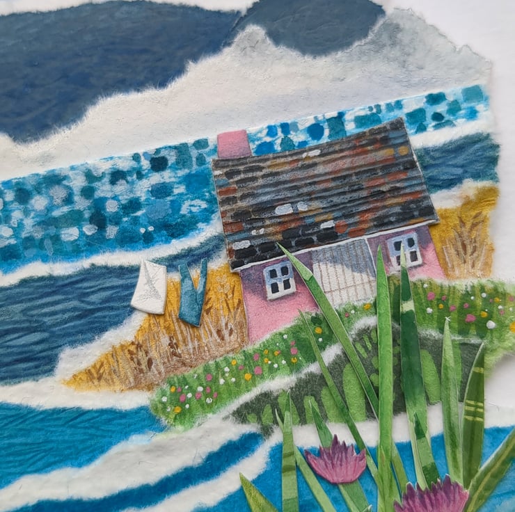 'Horizon Cottage' is an original paper collage, created using a mix of mediums - including gouache paints, water soluble pencils and different weight and texture of papers.