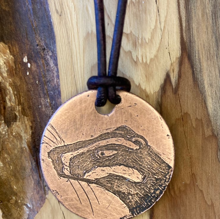 Acid etched copper pendant necklace with Badger portrait design.