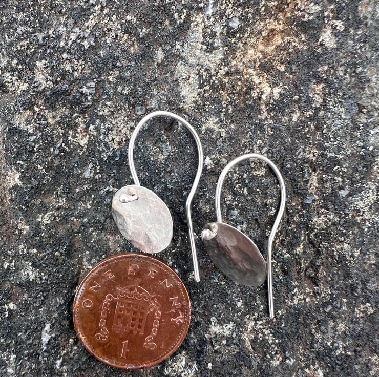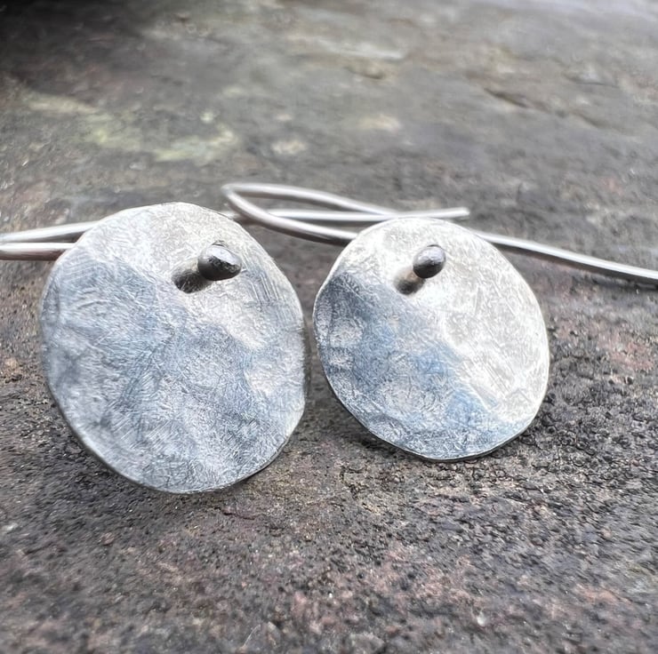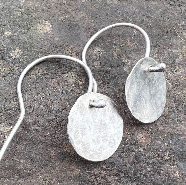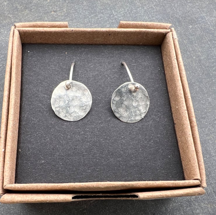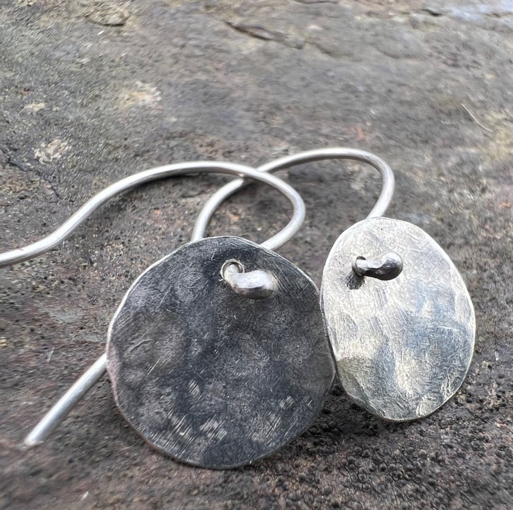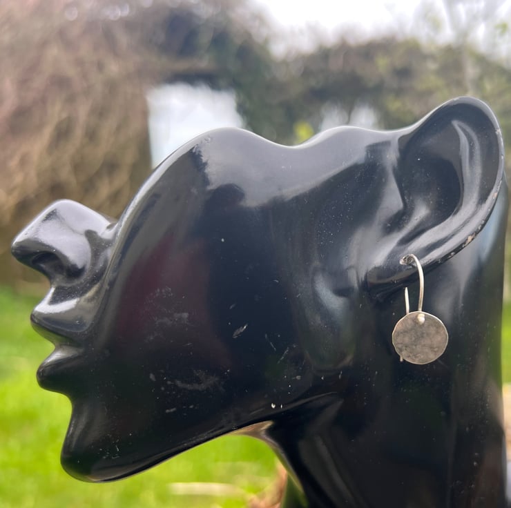 Delicate hammered silver circles dangling from sterling silver handmade ear hooks. The edges of the circles have gained a natural wavy line due to the hammering. The diameter of the circle is 12mm/half an inch.