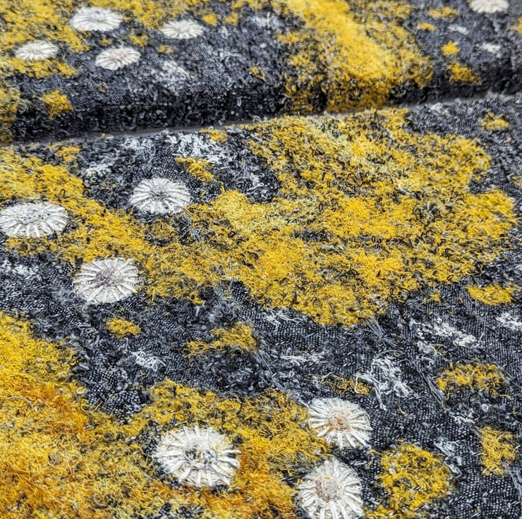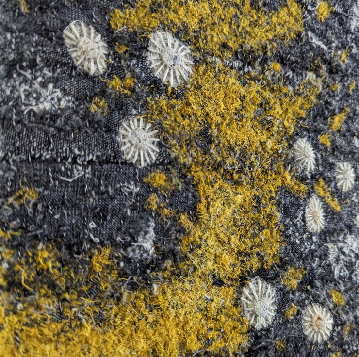I create coastal inspired textures using a combination of embellishing and embroidery; blending a variety of recycled fabrics to create subtle variations in tone. These are stitched inside waste plastic to cast true to life pieces with cement giving a distinct contrast between the manmade structure of the packaging and the soft natural textures of the textiles.