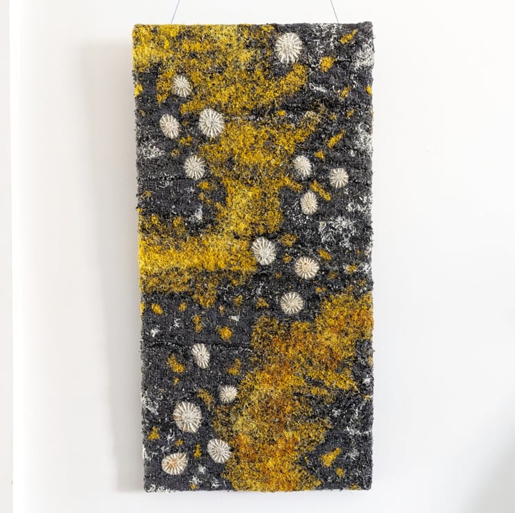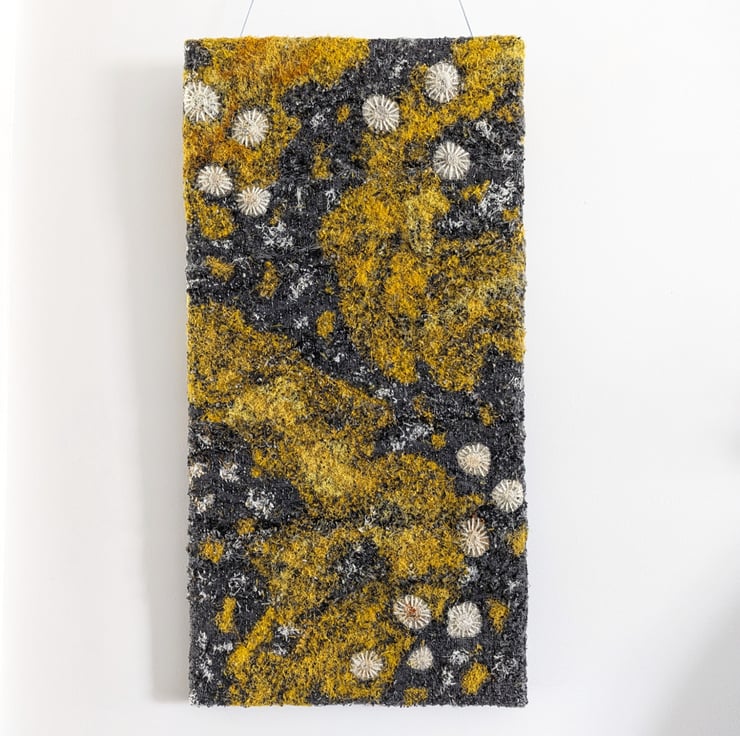My work investigates change over time, not just eroding or decaying but new layers of growth, giving juxtapositions of structure and colour. Recent work highlights the issue of plastic pollution and the permanence of disposables through sculptures that combine embellished textiles and cement cast in plastic waste, inviting us to consider the packaging that we use and discard on a daily basis; objects that are so lightweight and seem so insignificant that we barely notice them. Naturally inspired textures emphasise the way our waste becomes subsumed into the natural world around us.