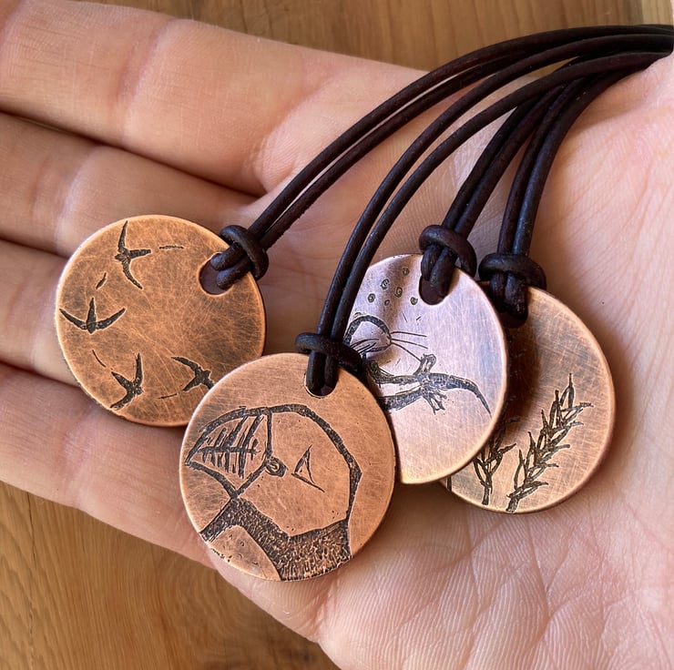 All pieces are lovingly and individually handmade; pendants are hand-cut and designs are individually scribed freehand before being acid etched and patinated - as such there may be slight differences from the listing photograph.