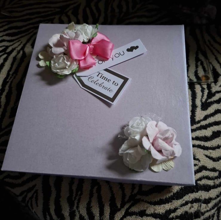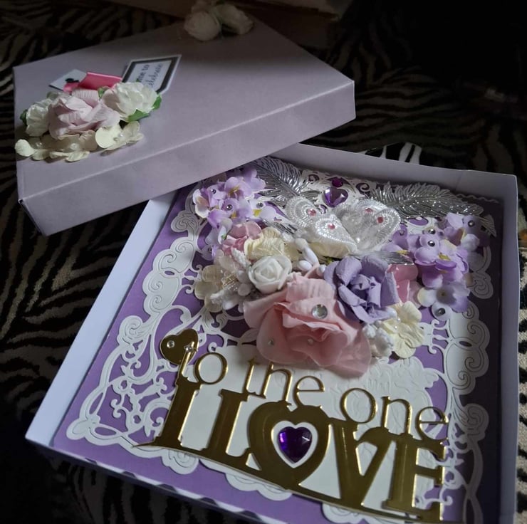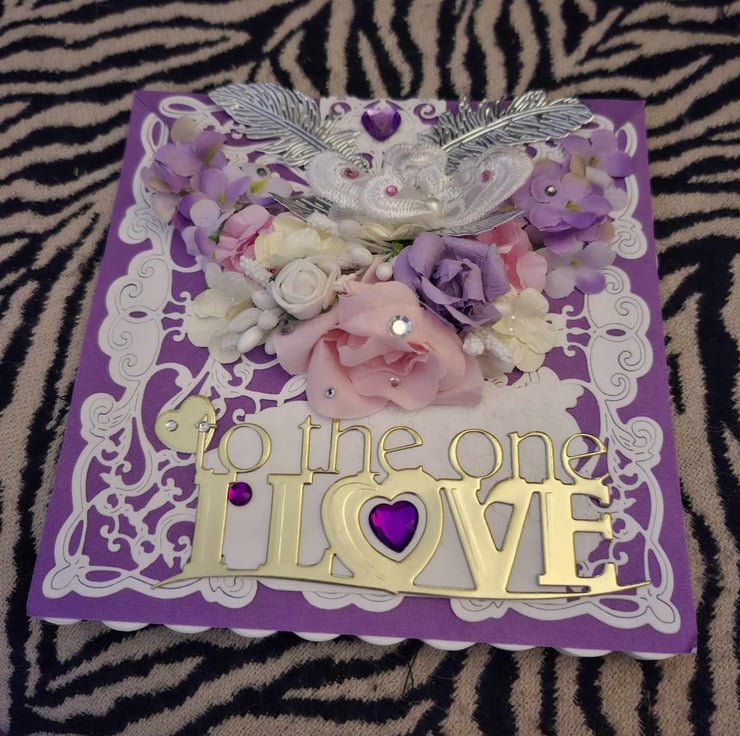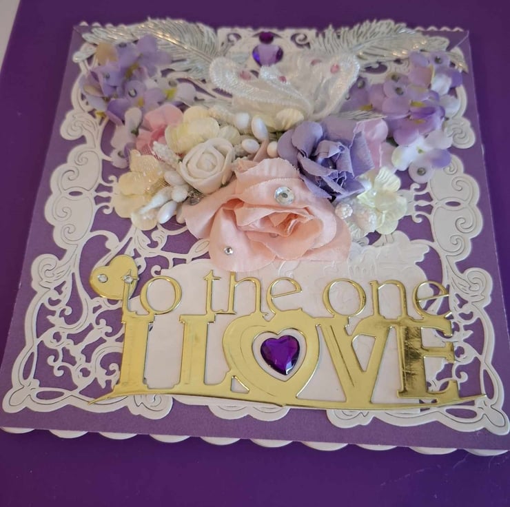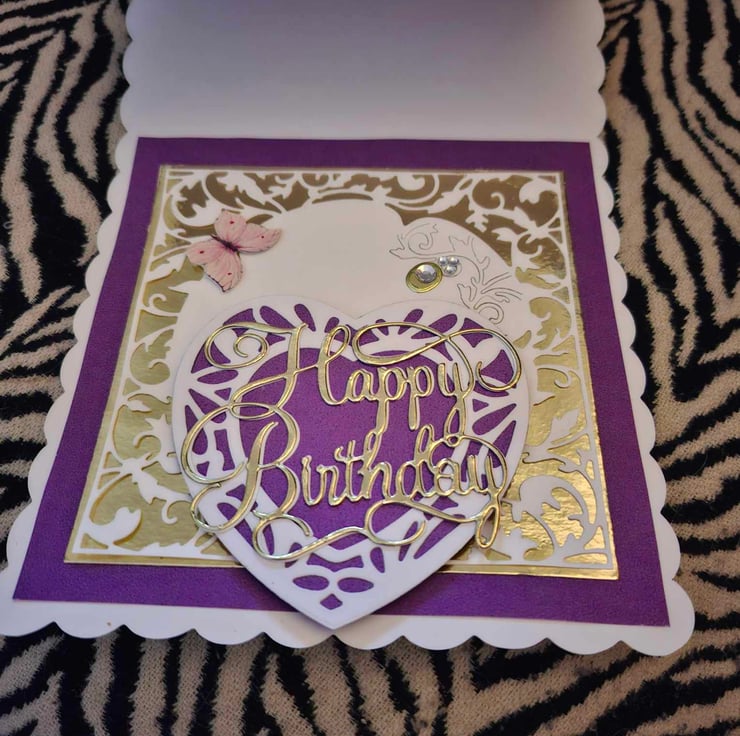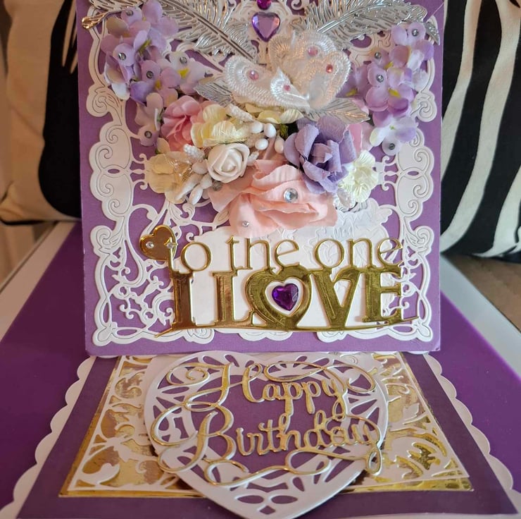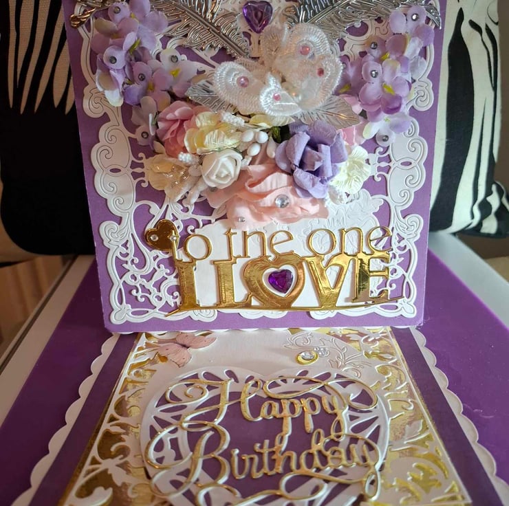 An Exquisitely Hand Crafted No Verse/Blank Interior Easel Card For All Occasions With Unique Designs. This Beautiful Decoupage/Collage Easel Card Compilation Of Silk Flower Bouquet And Decoupage/Collage Accompaniments With A Lace Effect Overlayed On A Complimentary Purple Background And A Gold Letter Greeting, The Easel Stand Also Has The Lace Effect With A Beautiful Heart Shaped Stopper, On This Occasion With Happy Birthday In Gold Lettering, The Combination Of The Silk Flowers And Decoupage Accompaniments Give This Card A 3D Effect Of Realistic Perception And Depth You Could Almost Be Forgiven For Thinking The Flowers Are Real And Wish To Place Them In A Beautiful Crystal Vase When They Are Only Silk And Card, Each Card Is Lovingly Created With Intricate Detail For A Delight To Treasure And Will be Shown With A Decorated Box Or Cardelope Where Applicable Also Prices Reflect The Hours Of Crafting This Unique Card And Quality Of Materials Used.