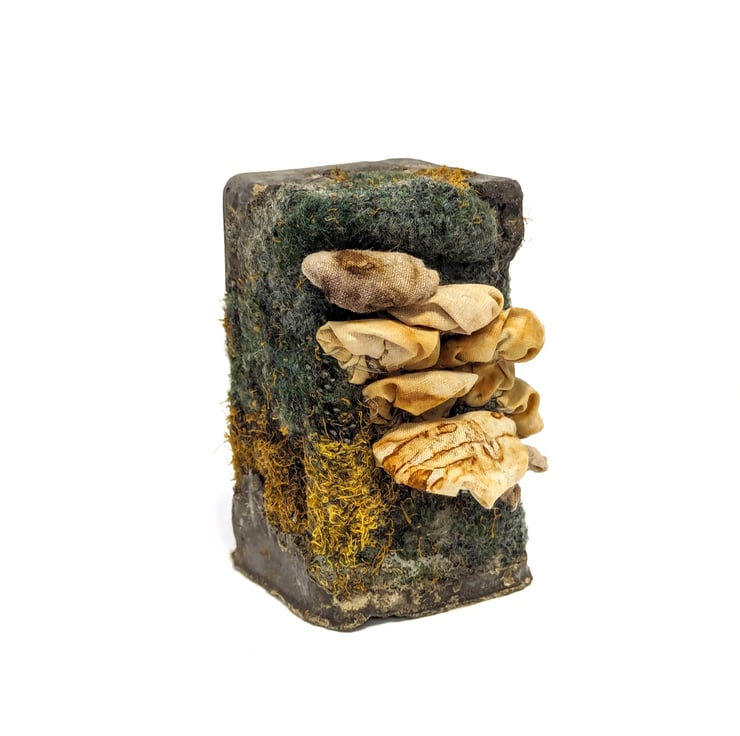 My work investigates change over time, not just eroding or decaying but new layers of growth, giving juxtapositions of structure and colour. Recent work highlights the issue of plastic pollution and the permanence of disposables through sculptures that combine embellished textiles and cement cast in plastic waste, inviting us to consider the packaging that we use and discard on a daily basis; objects that are so lightweight and seem so insignificant that we barely notice them. Naturally inspired textures emphasise the way our waste becomes subsumed into the natural world around us.