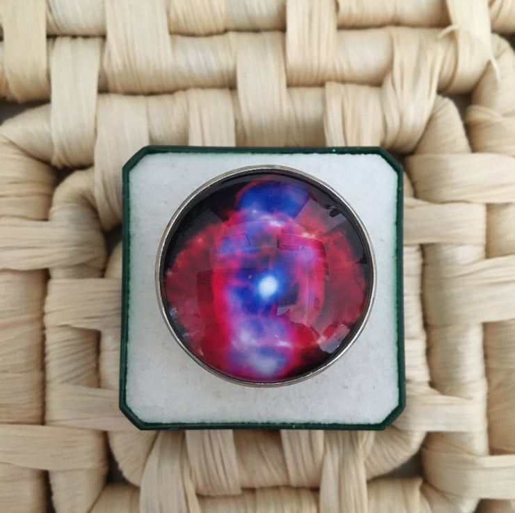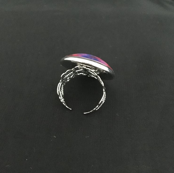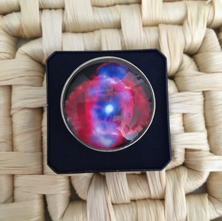 In red and blue bursts of colour this ring measures 25mm across the centre. It is glass domed covering the printed design.