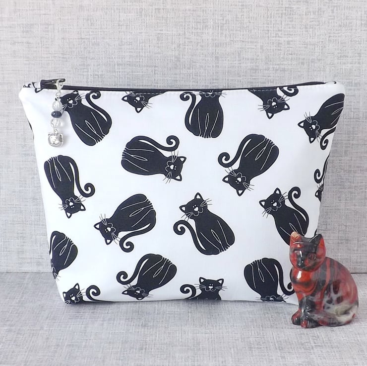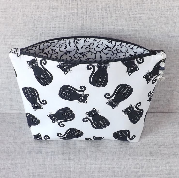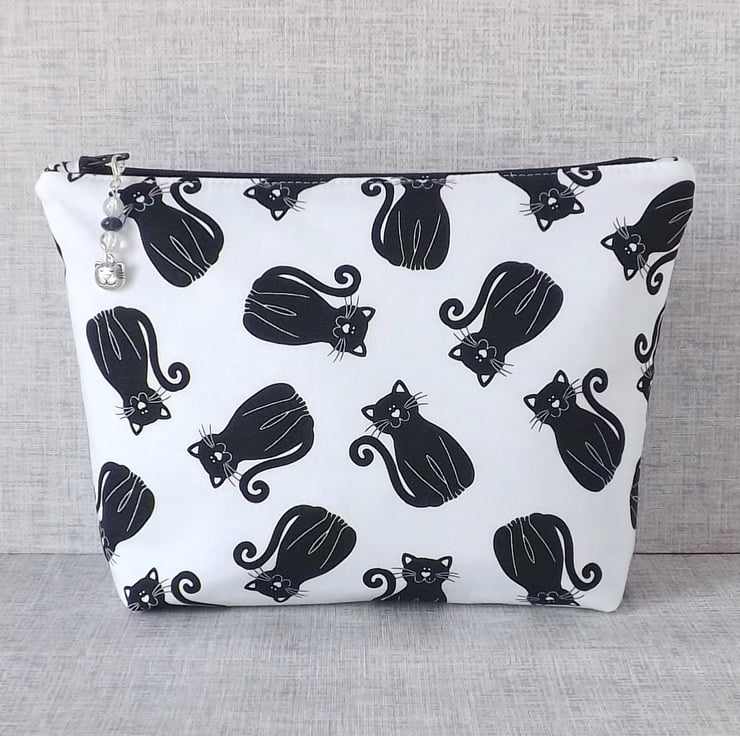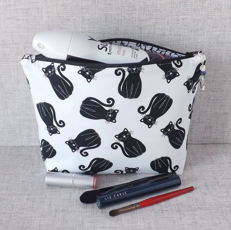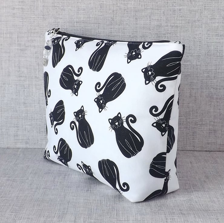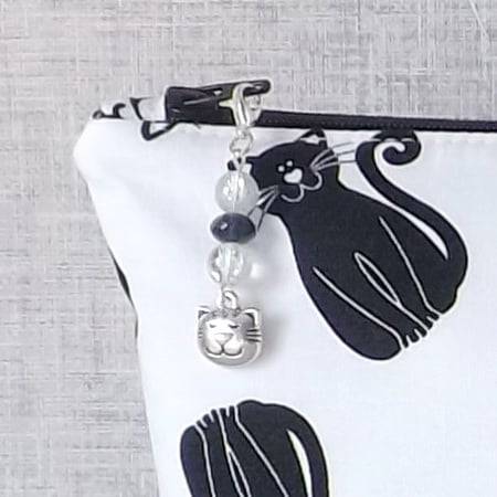 The fabrics have been backed with interfacing to give body to the bag, and there is a zip closure on the top with a removable bead & cat charm on the zipper pull.