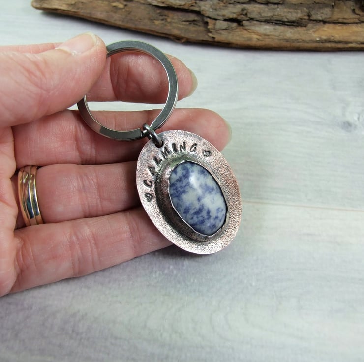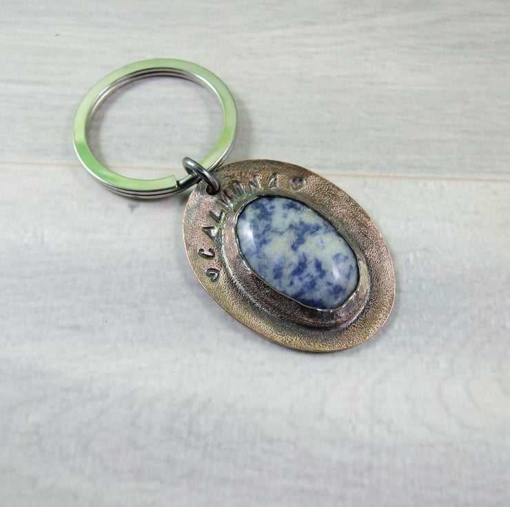 Keyring, Copper and Calming Sodalite Bag Charm. Hand stamped with hearts and calming. 7th Wedding Anniversary Gift. Can also be worn as a pendant necklace.
