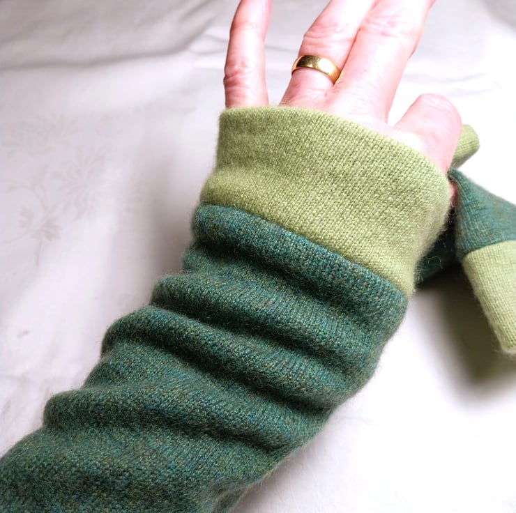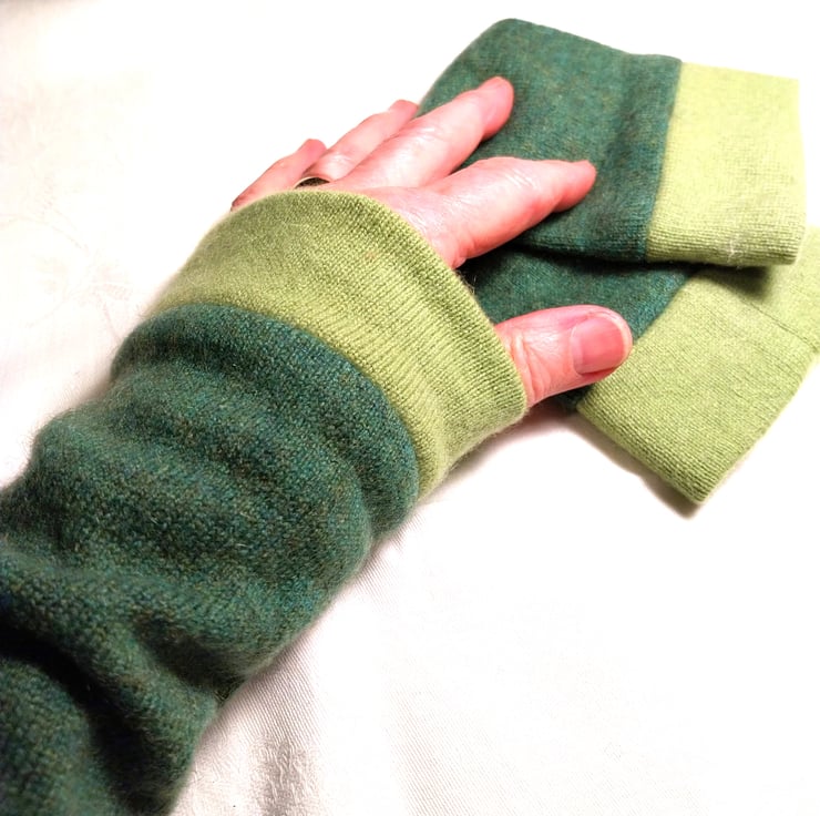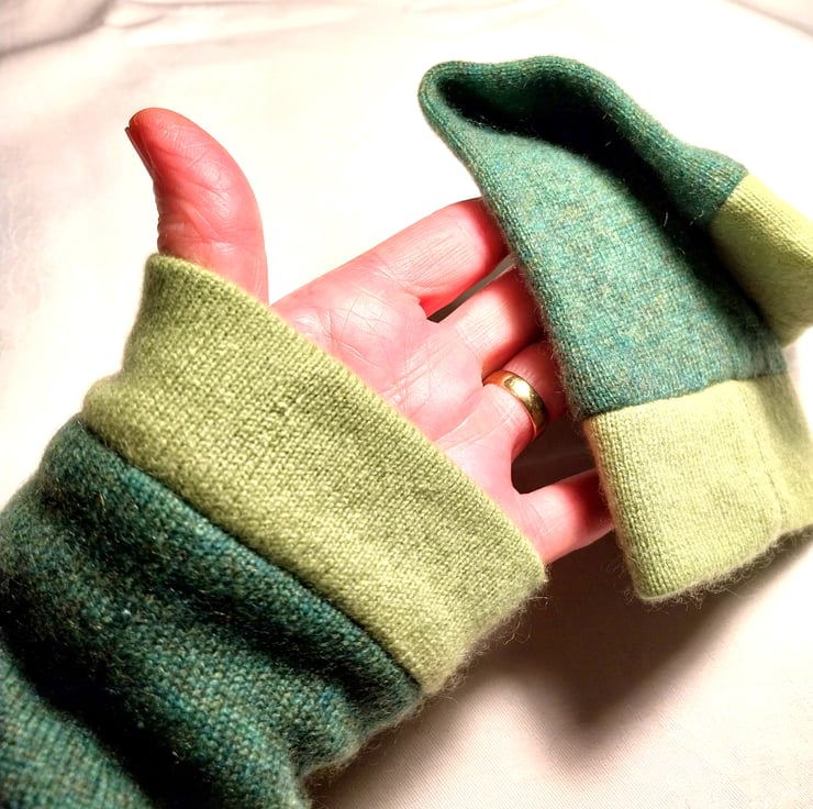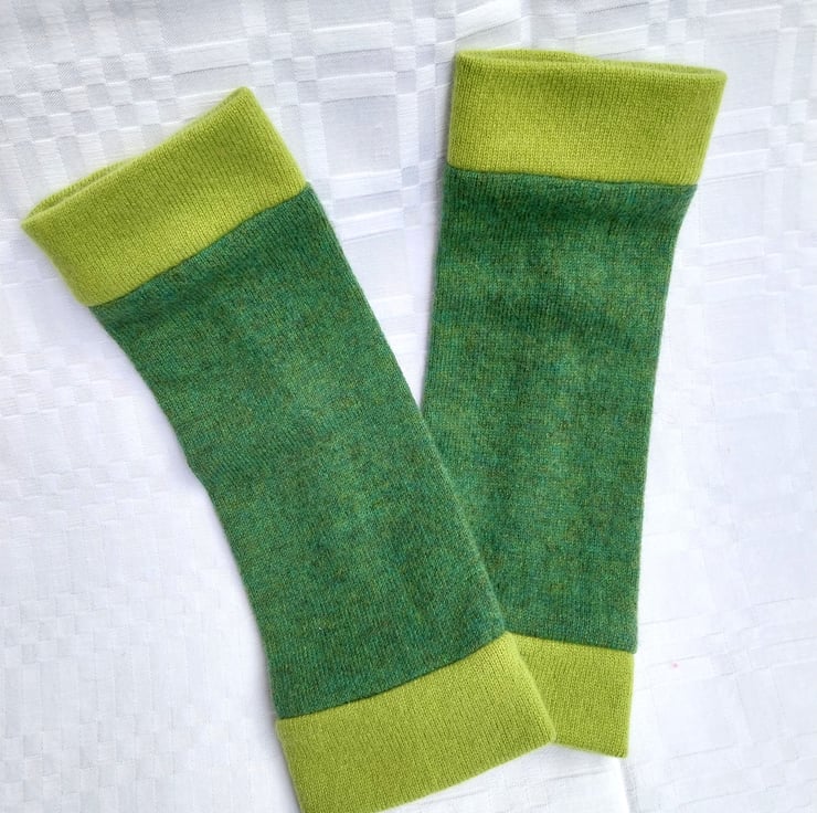 These two greens wrist warmer are so soft and cosy! The accessories I make are made from 100% cashmere garments that I have repurposed. These garments are used cashmere cardigans and jumpers which I wash, slightly felt and de-bobble to make the fabric beautiful again. The wrist warmers measure approximately 26cm ( 10 inch) in length and 9cm (3.5 inch) diameter and have stretch in them. They fit an average hand. These wrist warmers would also make a wonderful gift for someone!