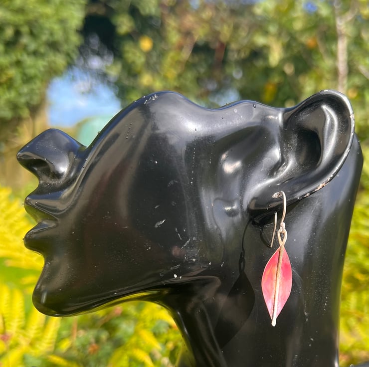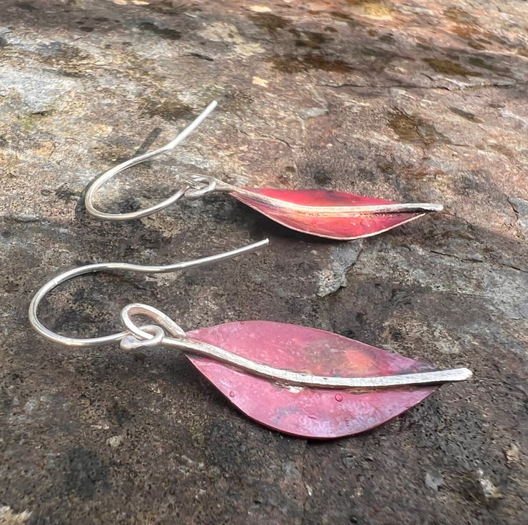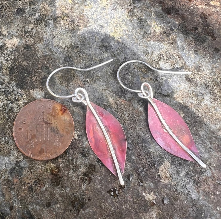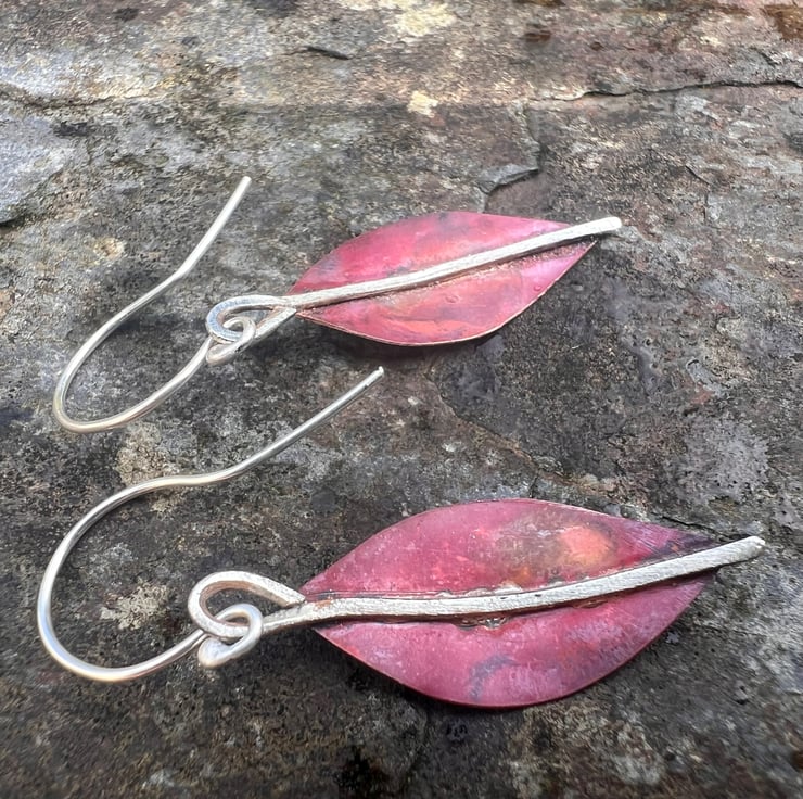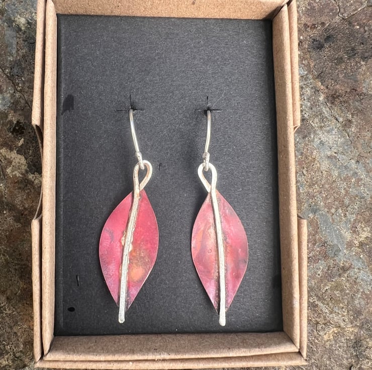 Copper leaf earrings with a slight curve. There is a sterling silver strip soldered down the centre, made with flattened sterling silver wire which forms a loop at the top of the leaf , to attach the ear hook . The copper has gained luscious red hues from the heating process and this is preserved with penetrating wax.