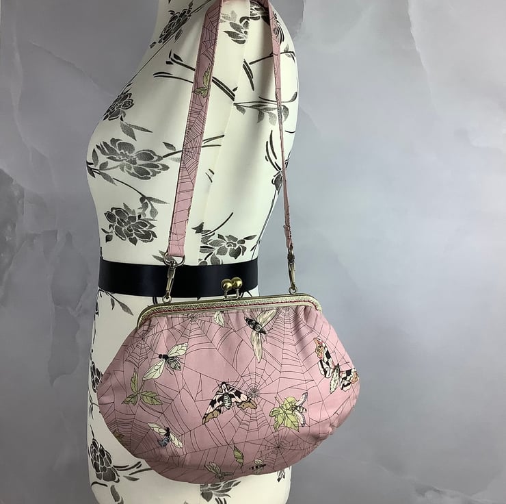 The metal kiss lock frame is hand stitched using thick pearl cotton thread in a complimentary tone.