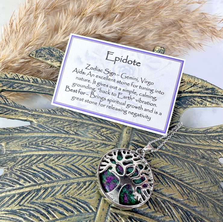 The Epidote pendant measures 26mm in diameter and comes complete with a printed card, which gives the properties associated with the Epidote crystal. The card also gives the associated zodiac sign, which is unrelated to the specific properties of the stone.