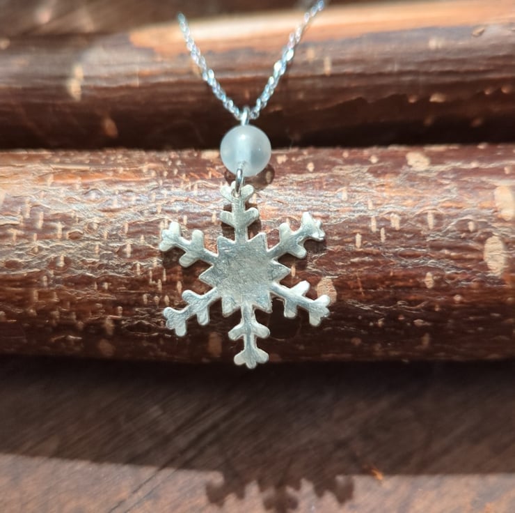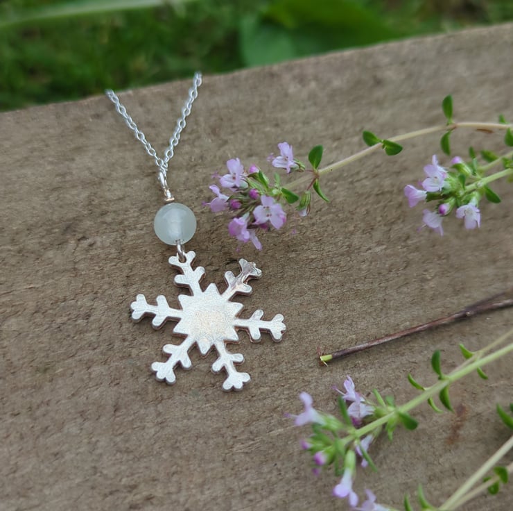 Add little shine to winter outfits with this silver snowflake necklace, with snow quartz pendant.