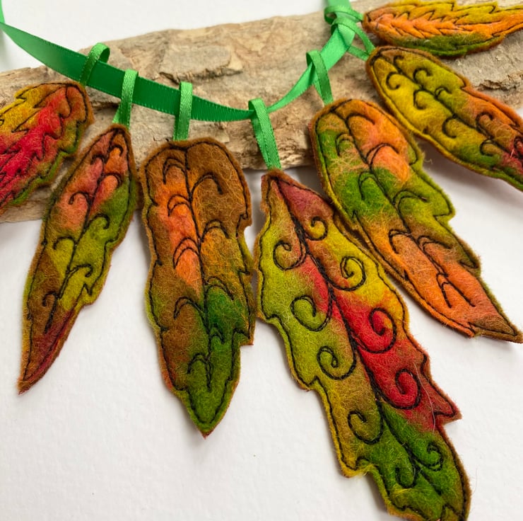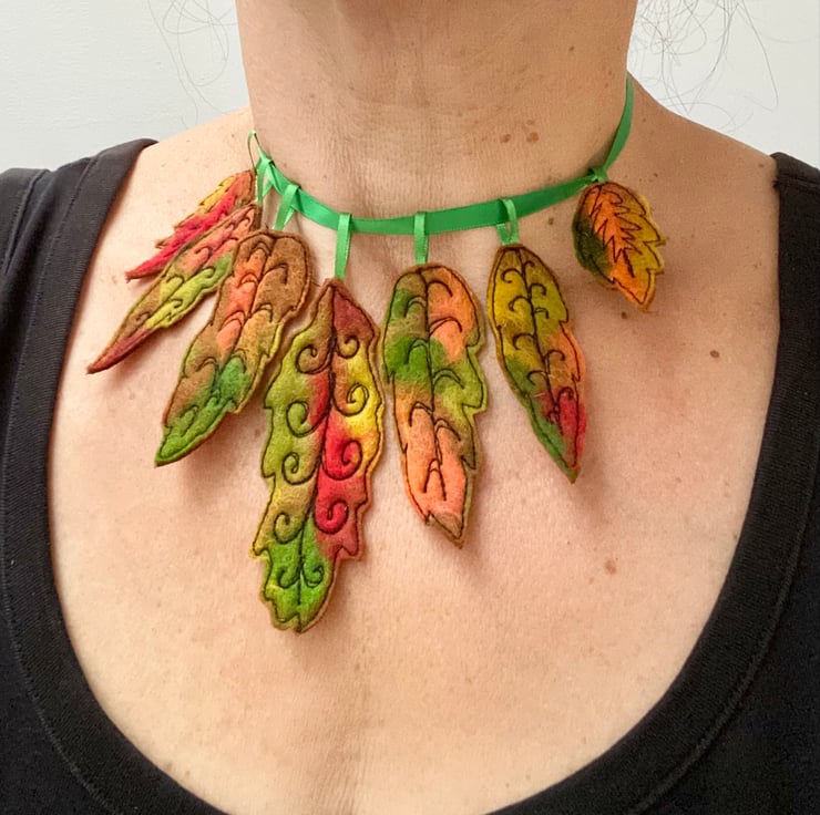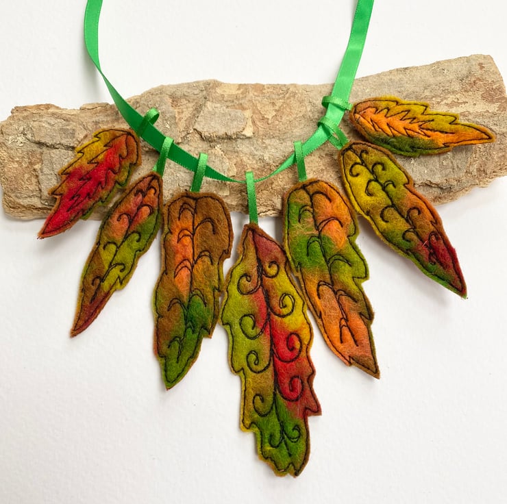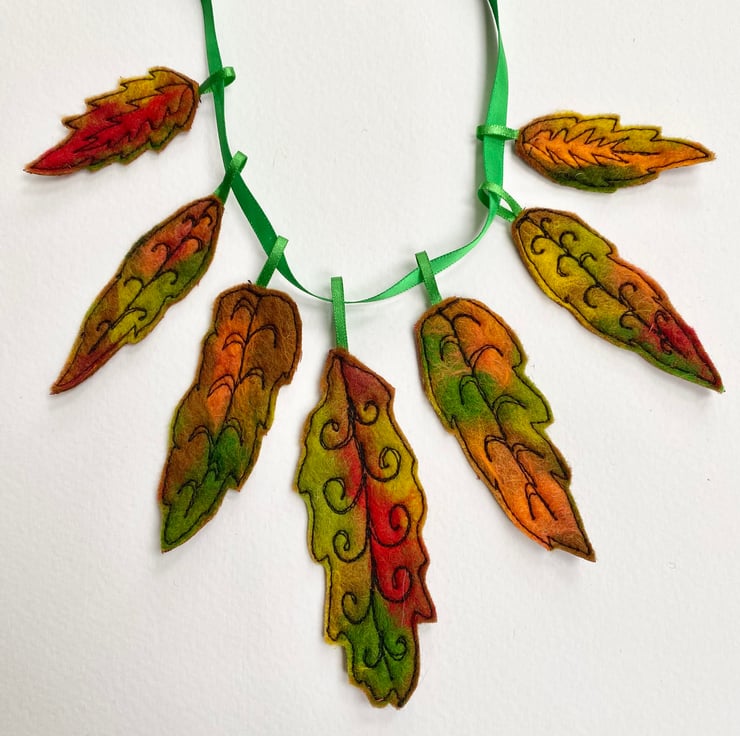 Autumnal leaf wet felted necklace on ribbon enhanced with free motion embroidery. There are seven leaves, the largest being 3 x 9cm, then two at 2.5 x 7.5cm, then two at 6.5 x 7, lastly two at 5 x 2cm. Each leaf has a ribbon loop to thread it onto the main ribbon. Each loop is approx 1.5cm long. It can be worn as a chocker to a longer necklace.