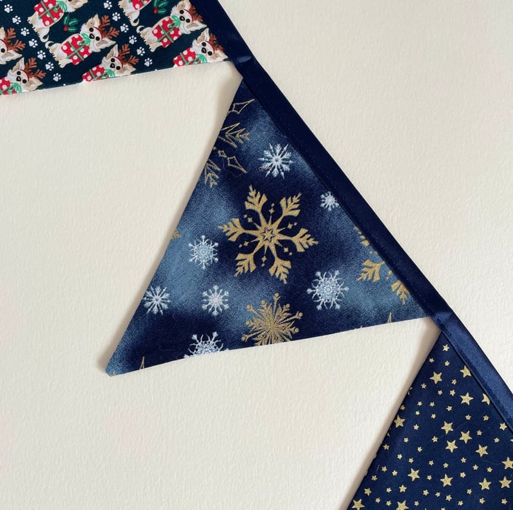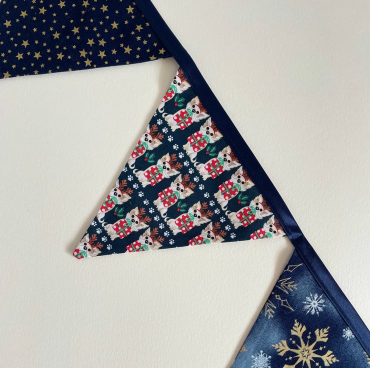 9 double sided panel bunting with doggies and golden stars. 229 cm long from one end to the other. The flags are approx 14 cm long and 14 cm wide at the top.