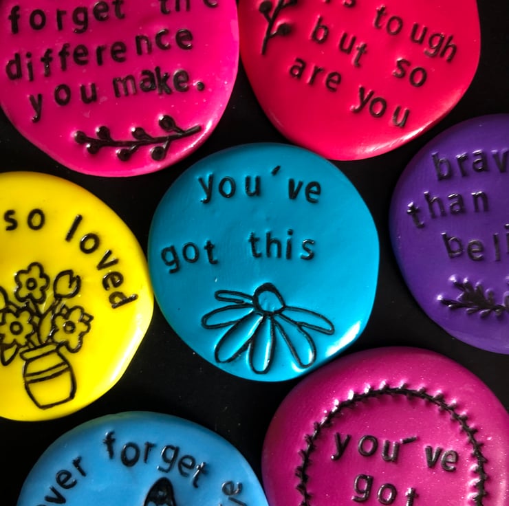 As a primary school art teacher, I know that words have the power to build and encourage and I get to see the joy of word spoken light up a little face. I started making these polymer pebbles as flower designs on cards, but was quickly asked to make these as pebbles that could be held and treasured. Words were then added to produce the designs you see before you.