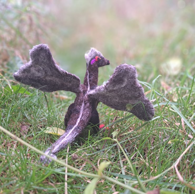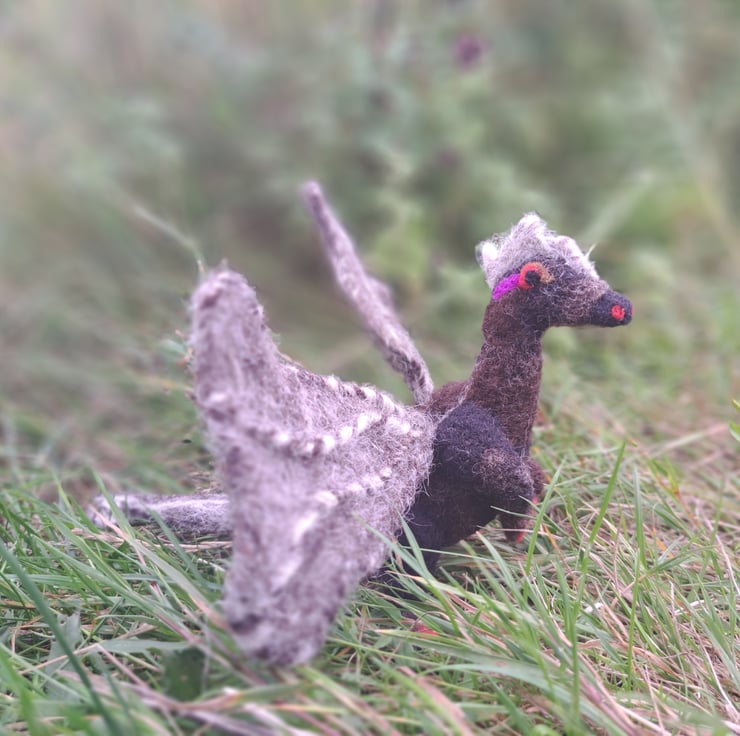 The majority of your dragon is made from raw sheep wool, cleaned and undyed, from the UK. The wings are fabricated from wool with copper wire to make them sturdy and flexible. Tiny pops of dyed wool make up the features.