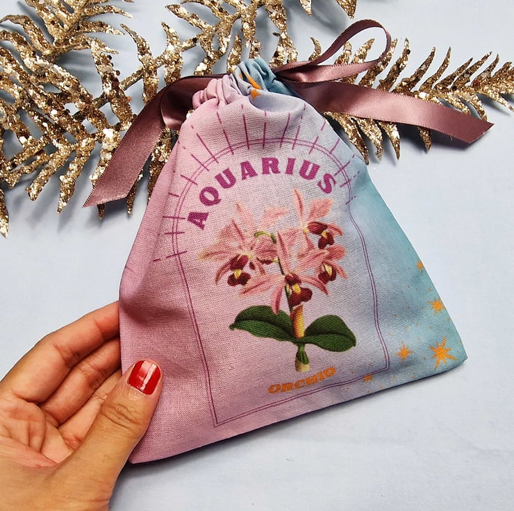 Each zodiac sign is celebrated through the associated birth flower and constellations, making each pouch unique to the individual.