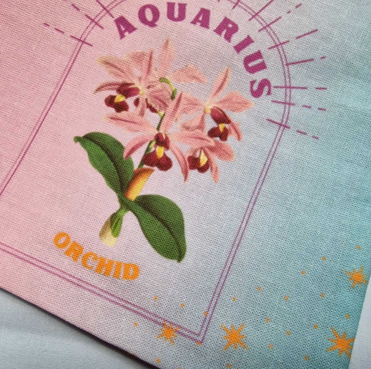 - Adorned with a magical digital print of the Aquarius birth flower, flowing with a dreamy gradient across the front and back, crowned with the Aquarius constellation.