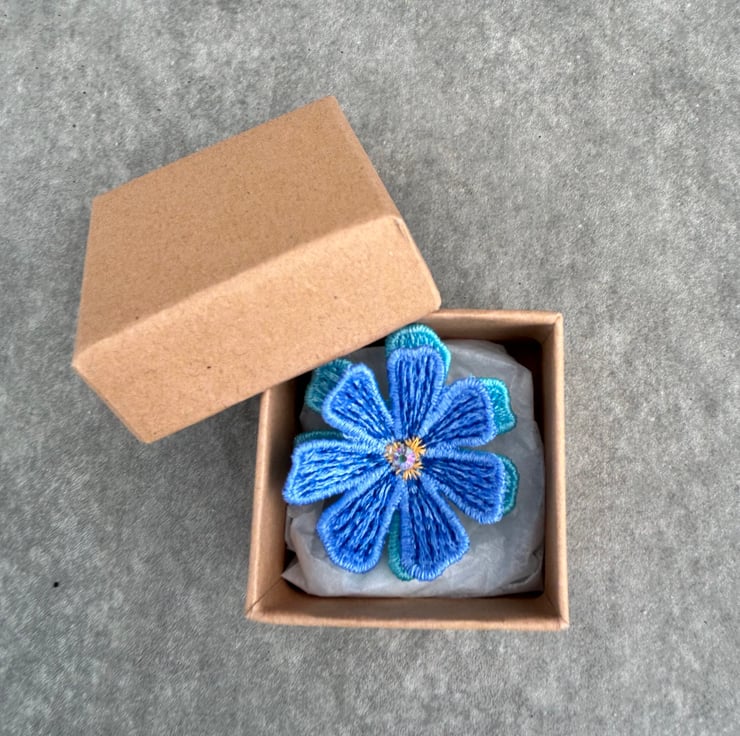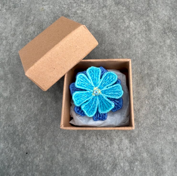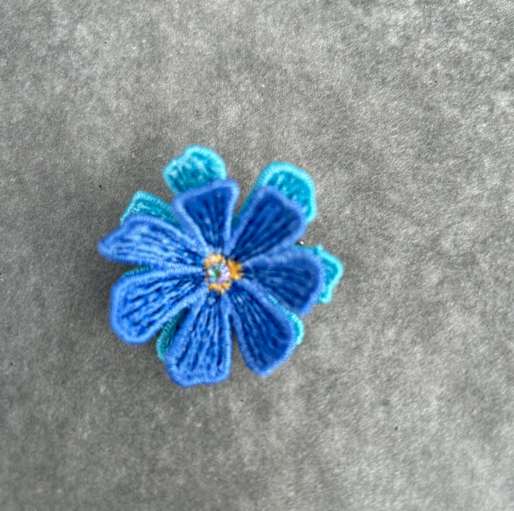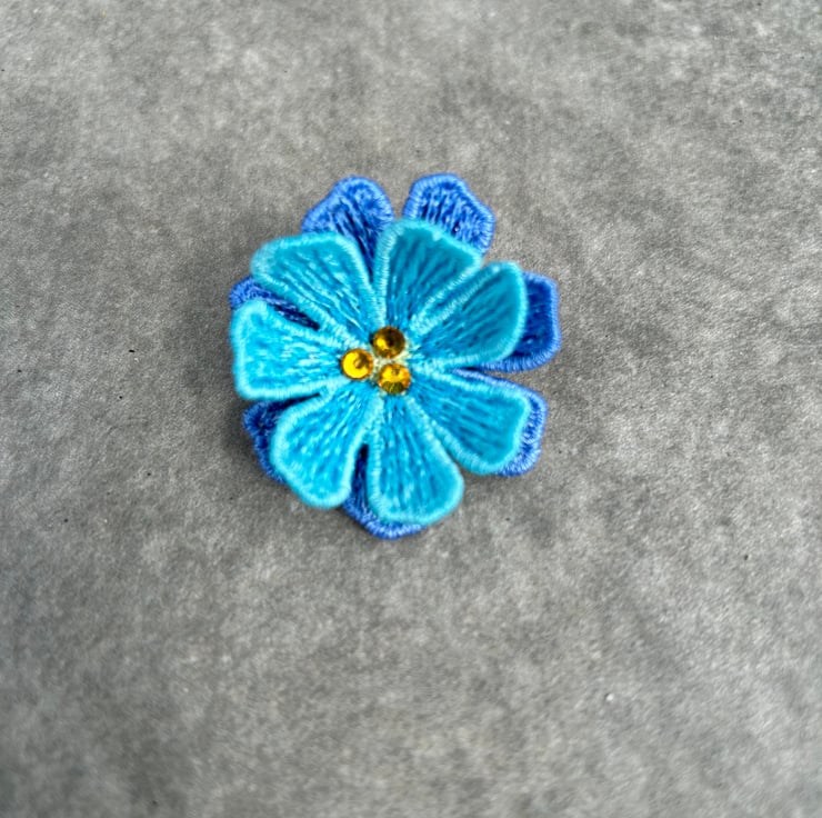 Machine embroidered blue and turquoise lace flower Brooch with three tiny glass crystal in the centre. Choose from blue petals on top with turquoise underneath or vice versa.