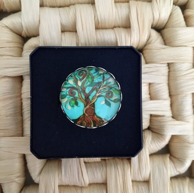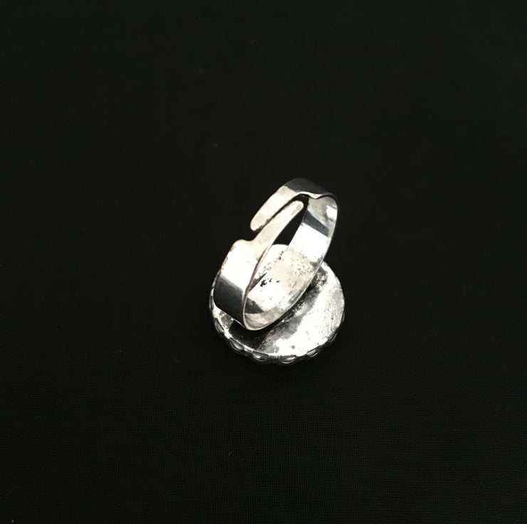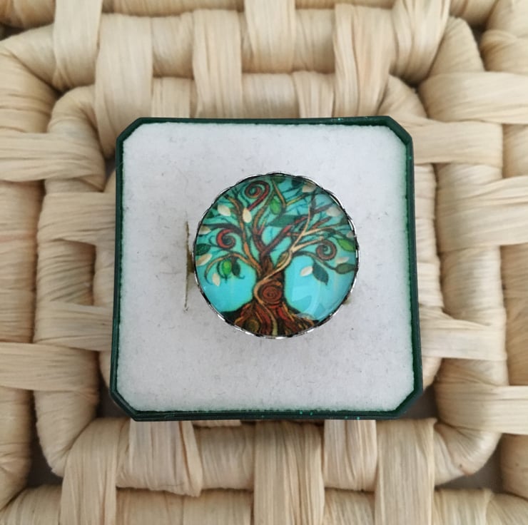 In a beautiful landscape with the tree outlined against the blue sky this ring measures 16mm across the centre. It is glass domed covering the printed design.