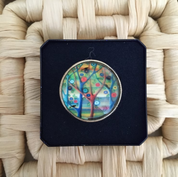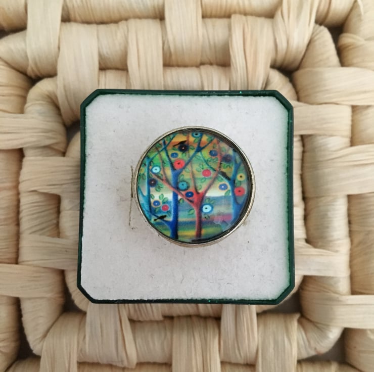 In a lovely landscape with the trees outlined against the sky this ring measures 16mm across the centre. It is glass domed covering the printed design.