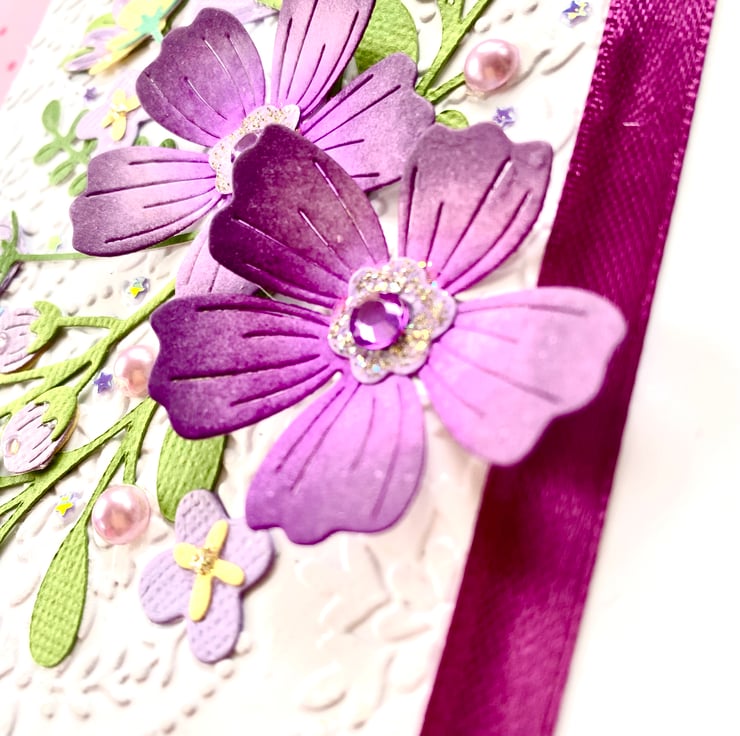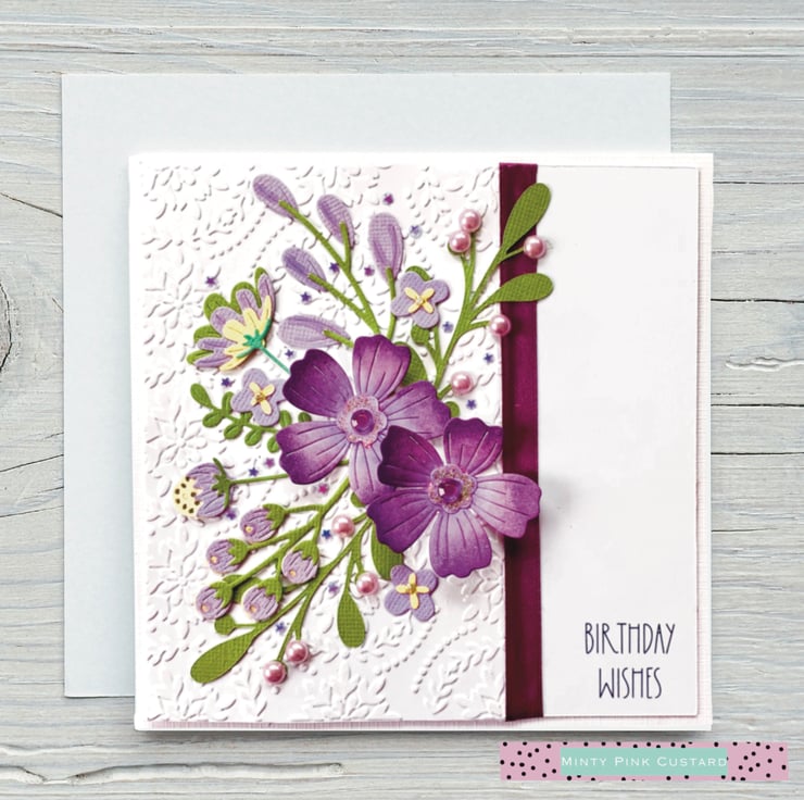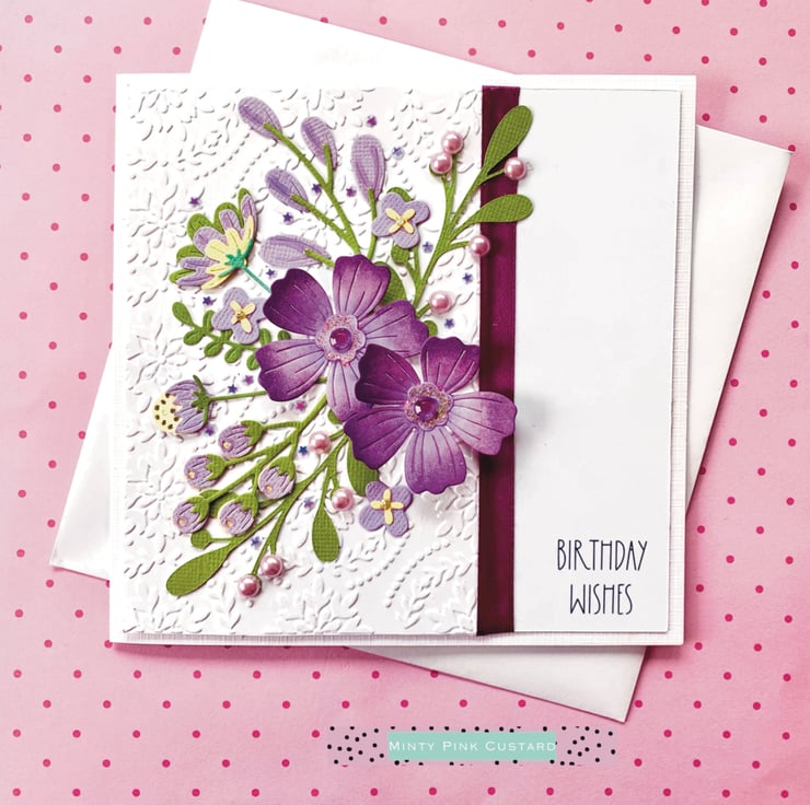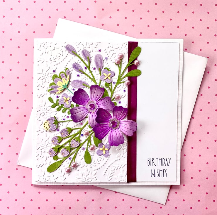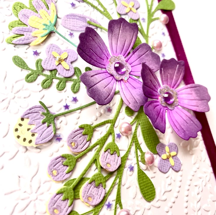 The card is made up from multiple layers of card, featuring an embossed background and a purple themed floral bouquet.