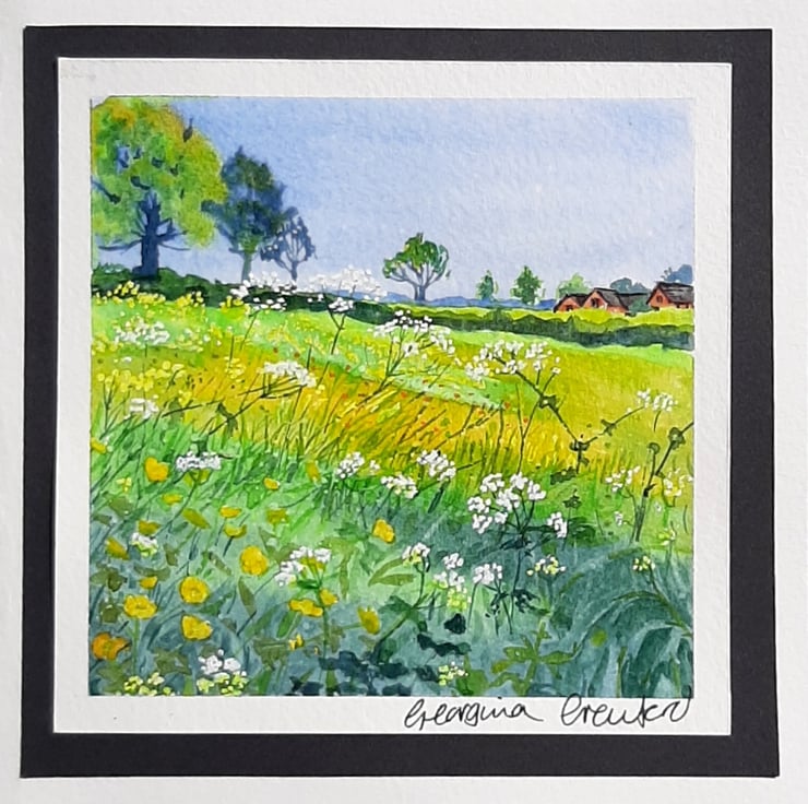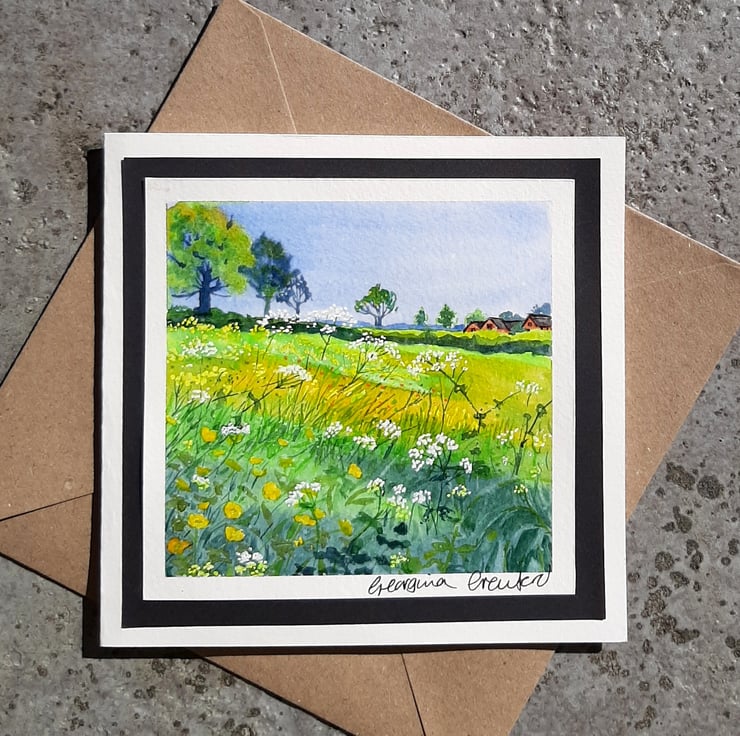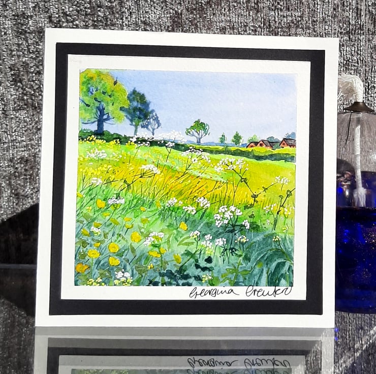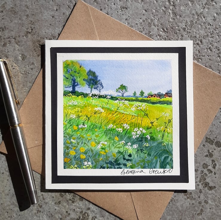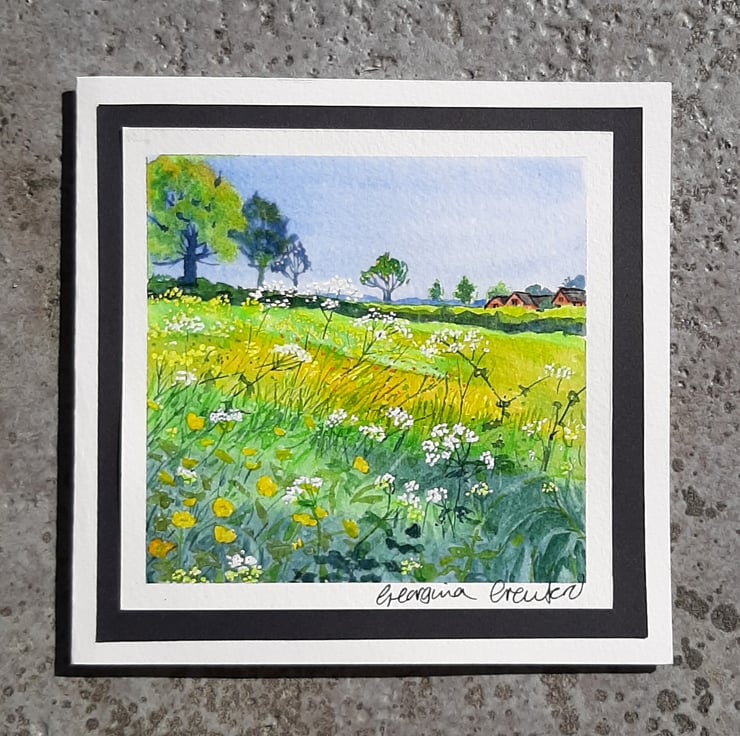 Beautiful handpainted watercolour card of a field of buttercups and cow parsley.