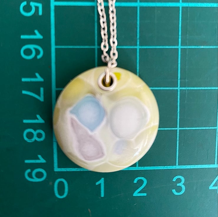 This unique pendant was made by fusing coloured glass and paint in layers multiple times at 870 degrees Celsius. The technique was developed by Liz Roets. A hole was drilled, a silver grommet inserted to allow it to hang on a 18” silver plated chain.