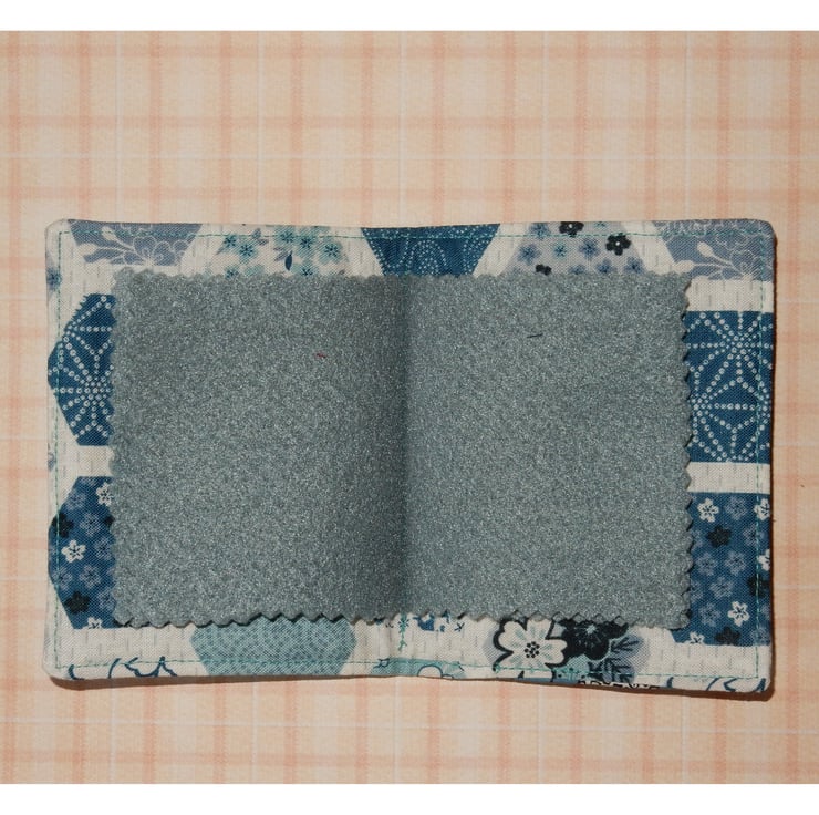 This cute needle case features black and white speckled hens in a variety of poses. It measures approx. 4.5 x 3 inches and is made from cotton fabric, in a lovely teal shade. It is lined in toning cotton fabric with a hexagon patchwork effect in the same colour, and has four felt leaves for your pins and needles.