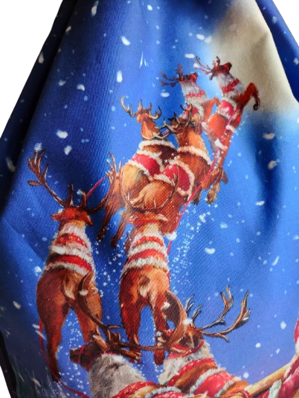Dasher, Dancer, Prancer, Vixen, Comet, Cupid, Donner, Blitzen and Rudolph are all ready and Santa is on his way. This gorgeous Santa sack is all ready to be filled with pressies and when your little one is sleeping to be hung up. On Christmas morning you will see their excited happy face. Made using both polycotton and cotton fabric with a cotton cord making it very easy to pull close then it's all ready to be hung up. And when their pressies have been opened and their sack is empty, it will look lovely anywhere around the Christmas tree! A unique Christmas Keepsake that can be used year after year and stories from Christmases past. Makes a lovely Christmas gift. Ready for posting now.