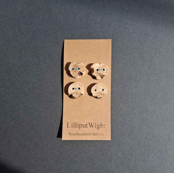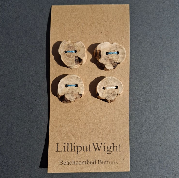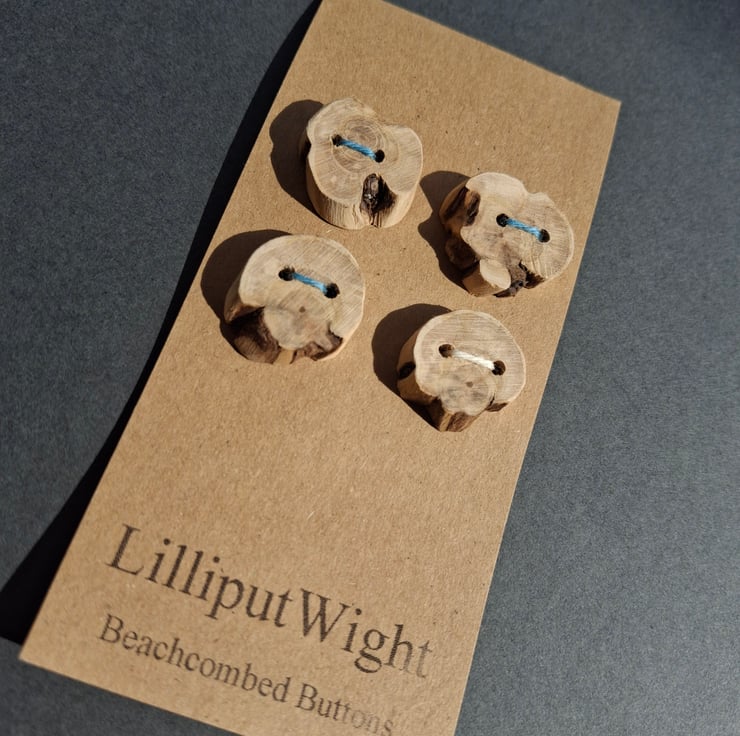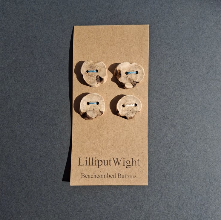 Working in my dad's shed this set of buttons has been made by me from driftwood collected from the beaches of the Isle of Wight.