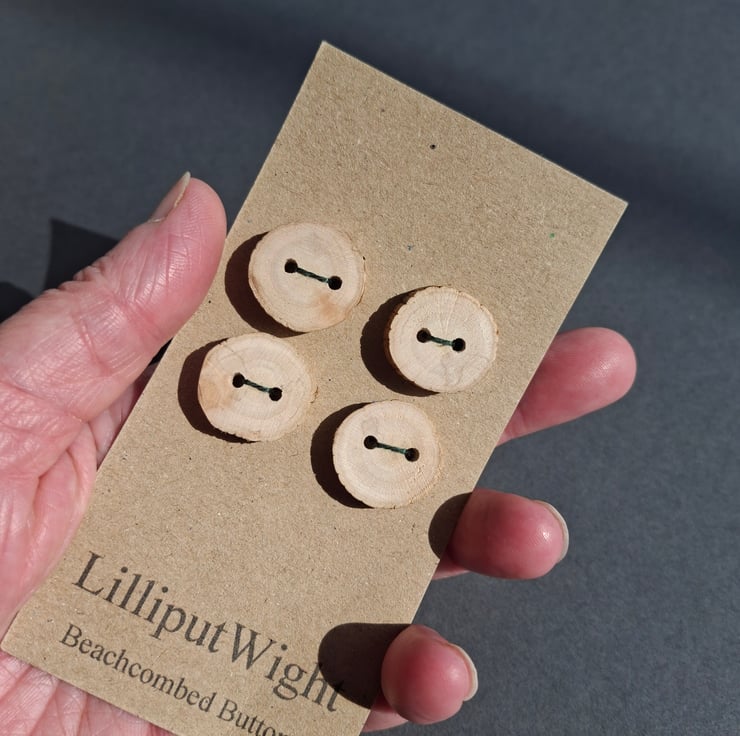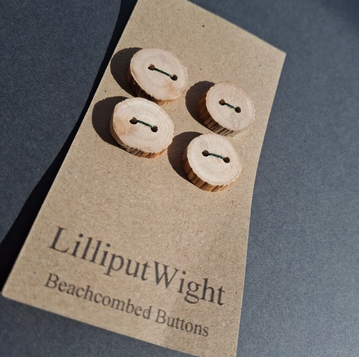 Working in my dad's shed this set of buttons has been made by me from driftwood collected from the beaches of the Isle of Wight.