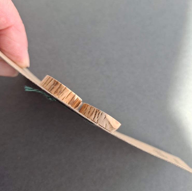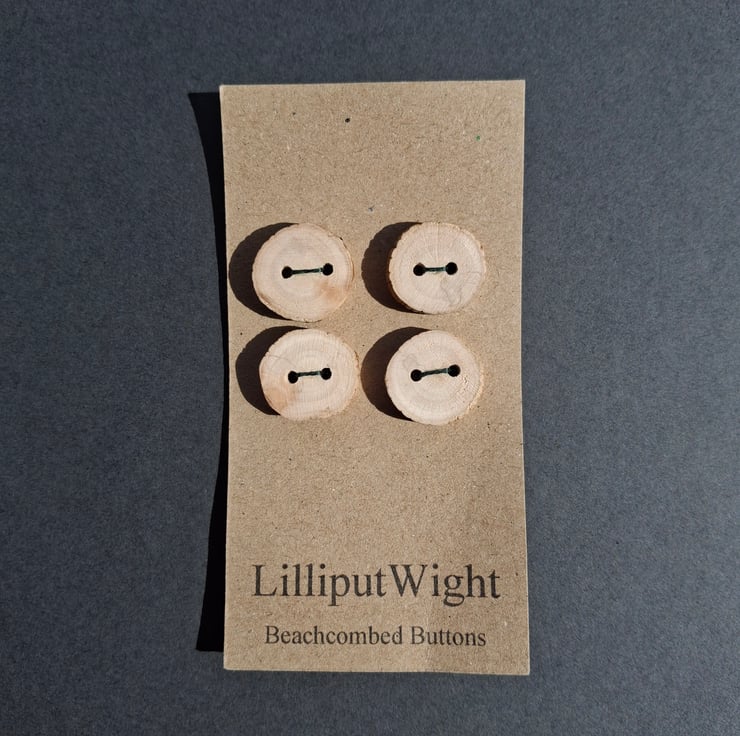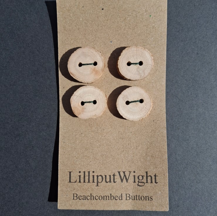 Each button is around 3/4" across and 1/4" thick and has been cut from a single piece of driftwood before being sanded and having holes drilled.
