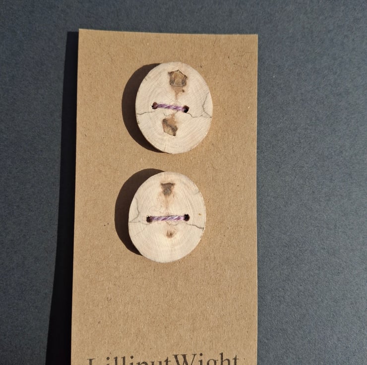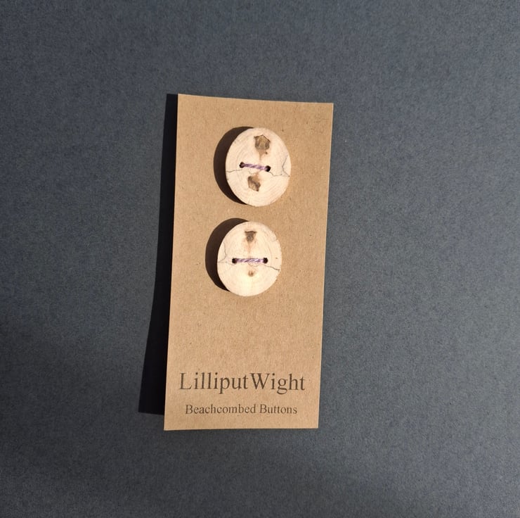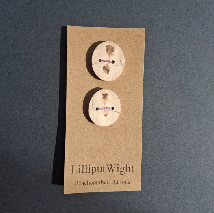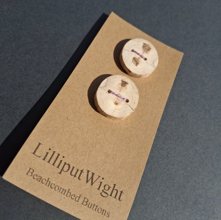 Each button is around 1" across and 1/4" thick and has been cut from a single piece of driftwood before being sanded and having holes drilled.