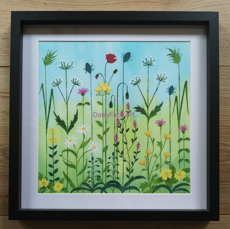 Sunny Meadow Flowers is a high quality giclee print of a painting I did in 2024. The original painted was created in acrylic inks and acrylic inks. It depicts a range of wide flowers in a sunny, illustrative style. The picture measures 25x25cm with a white border of approximately 2cm to enable framing to your taste - they will fit standard sized frames. The print is UNFRAMED and photos showing frames on this listing are for demonstration purposes only.