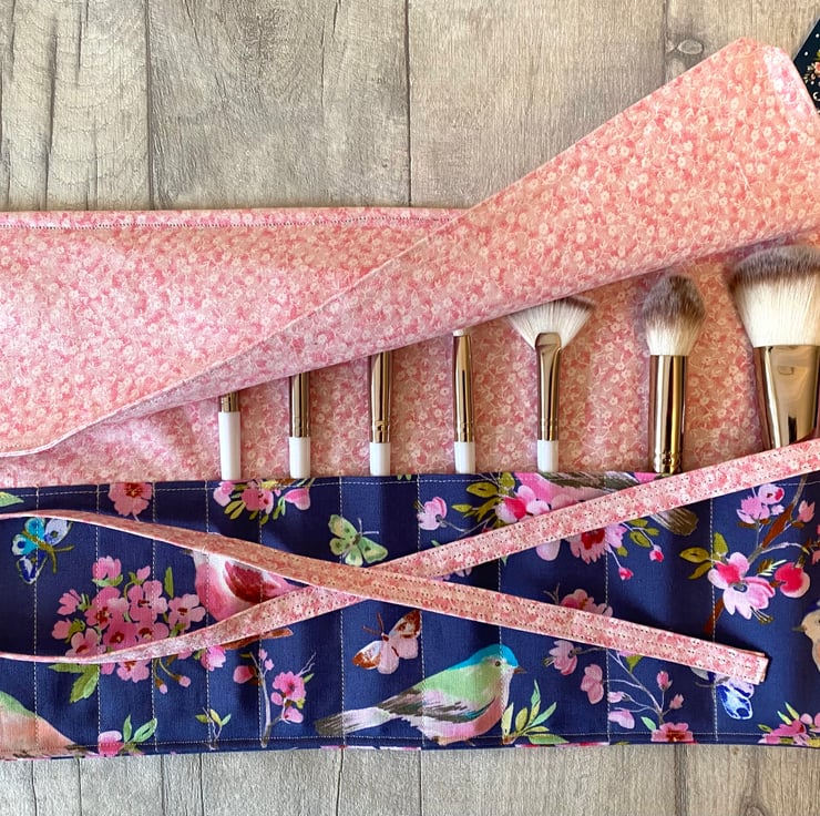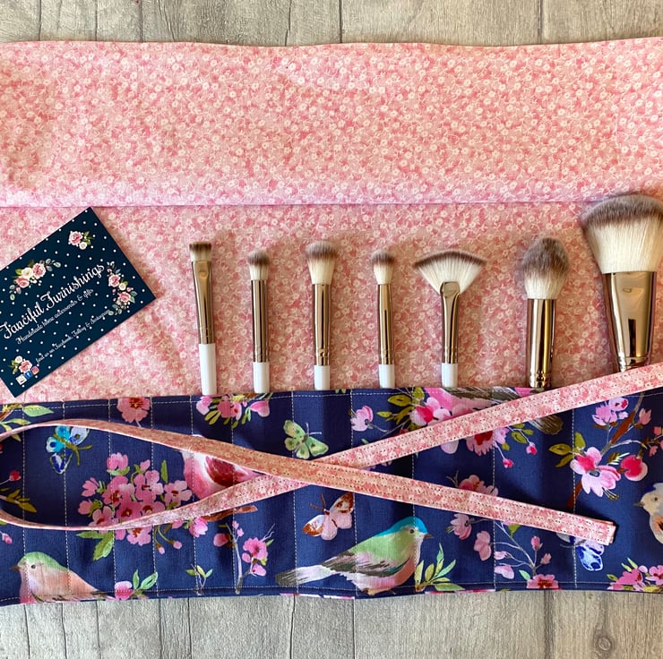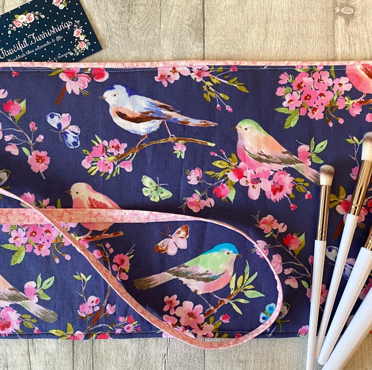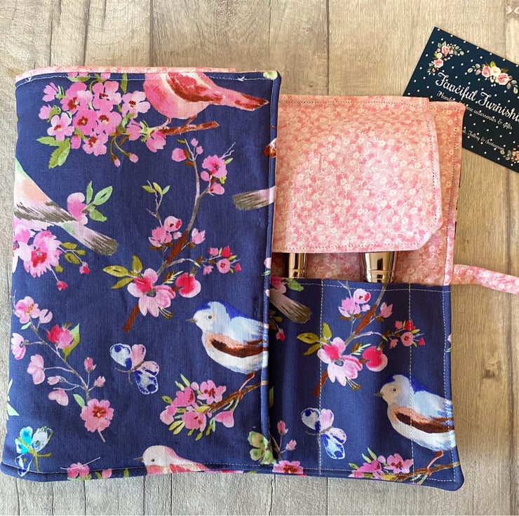 Beautiful cosmetic brush roll. The outer fabric is pretty whimsical bird design on a deep blue background. I’ve matched it with a pale pink ditsy floral fabric for the lining, flap and strap to bring out the pink in the print. Lots of room for all your brushes, with 14 slots of varying sizes so it can hold even the chubbiest of brushes. Measures approximately 38x 20cm. Perfect for use at home or if you’re travelling. These make lovely gifts.